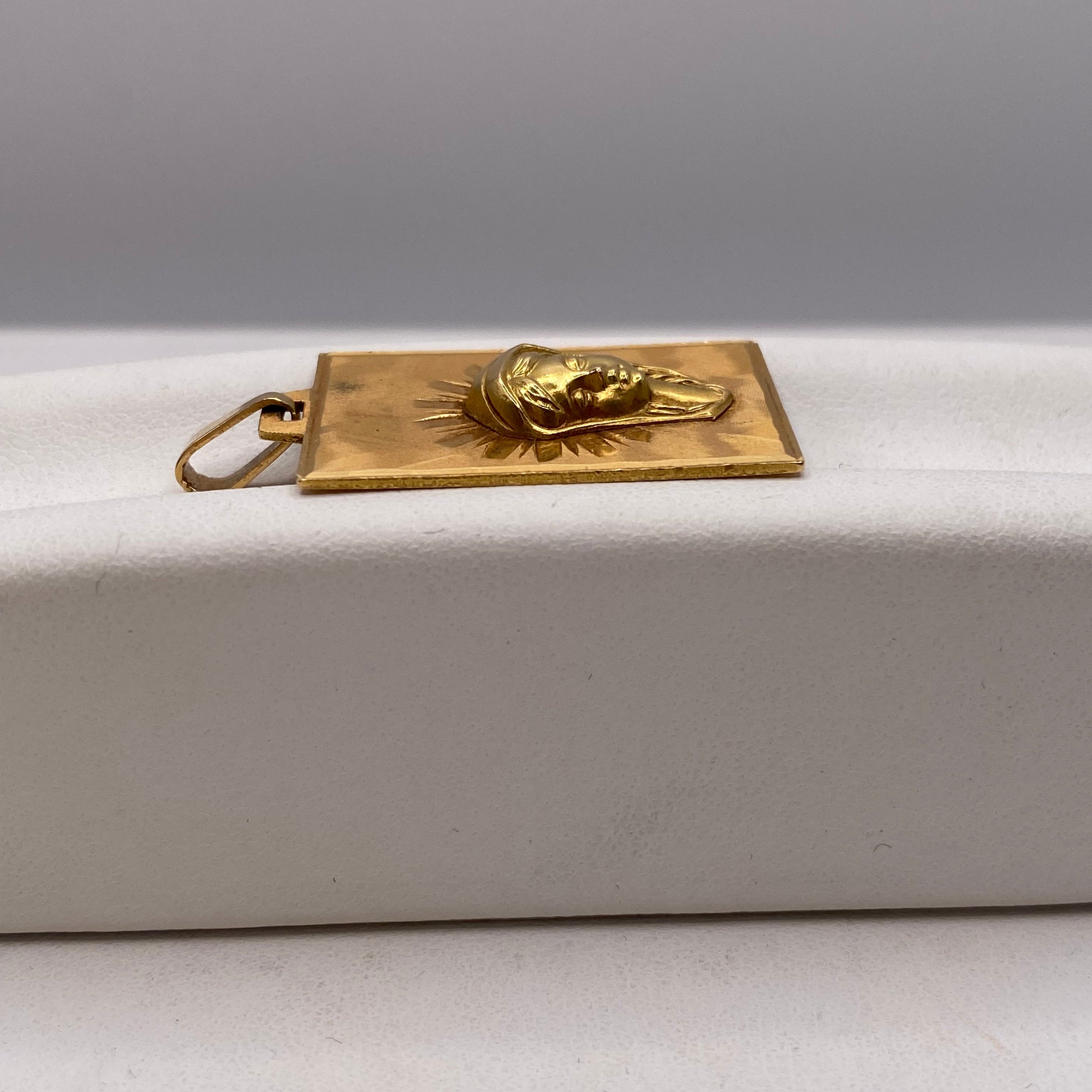 Pendentif en forme de médaille en or jaune 18 carats (750/1000), au design sobre et élégant. Il pèse 6,06 g et mesure 3,5 cm de hauteur avec bélière (3 cm sans) sur 1,5 cm de largeur, avec une épaisseur variant de 1 à 4 mm. Ce pendentif est sans pierres et présente au dos une gravure personnalisée “Marie Ève 26.9.55”. Il est vendu sans poinçon, dans un état soigné et authentique.