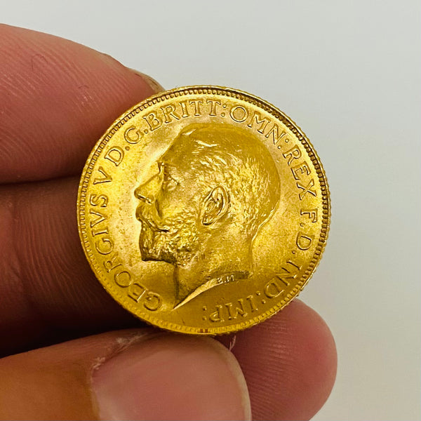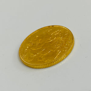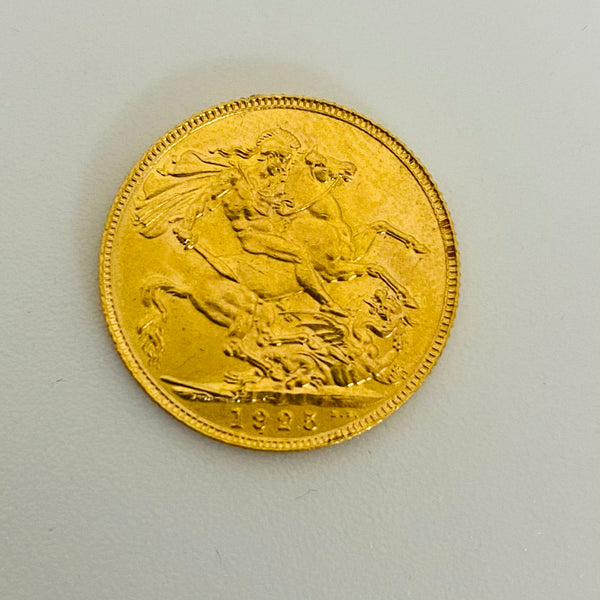 Pièce de type Souverain en or jaune, émise en 1925, avec un titrage de 999/1000. Elle mesure 22 mm de diamètre pour une épaisseur de 2 mm et un poids de 7,99 grammes. État : Très bon.