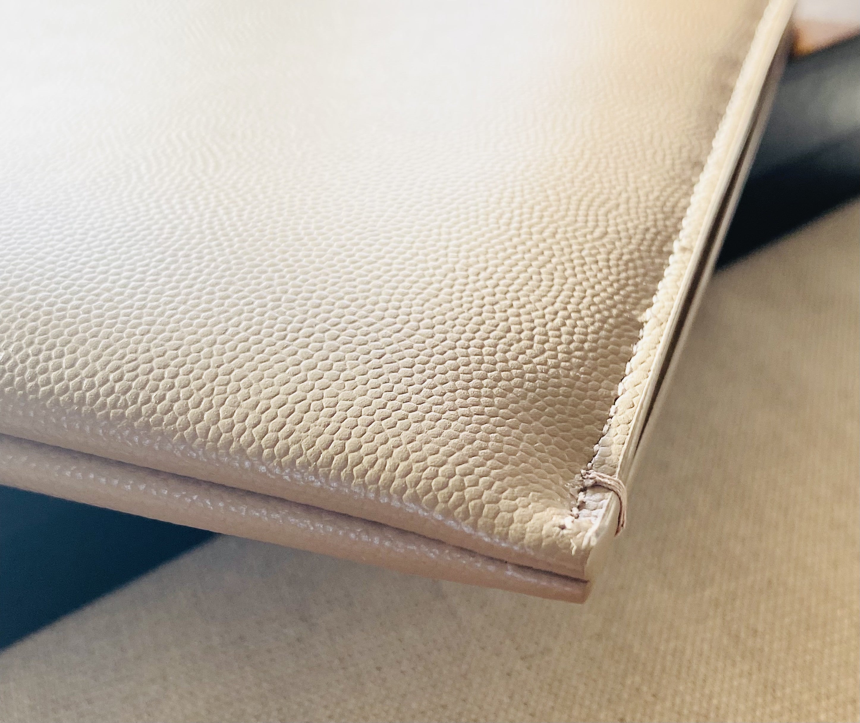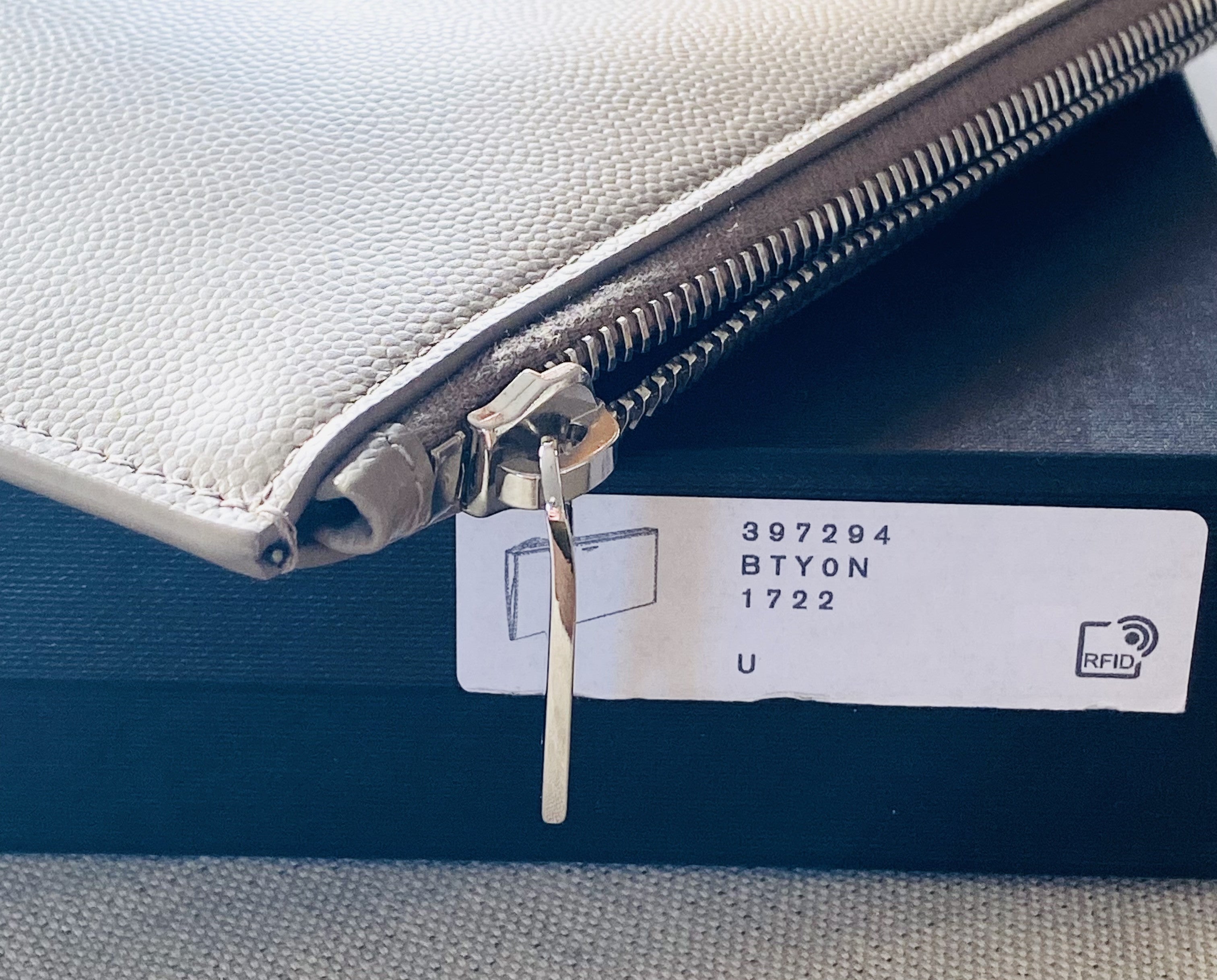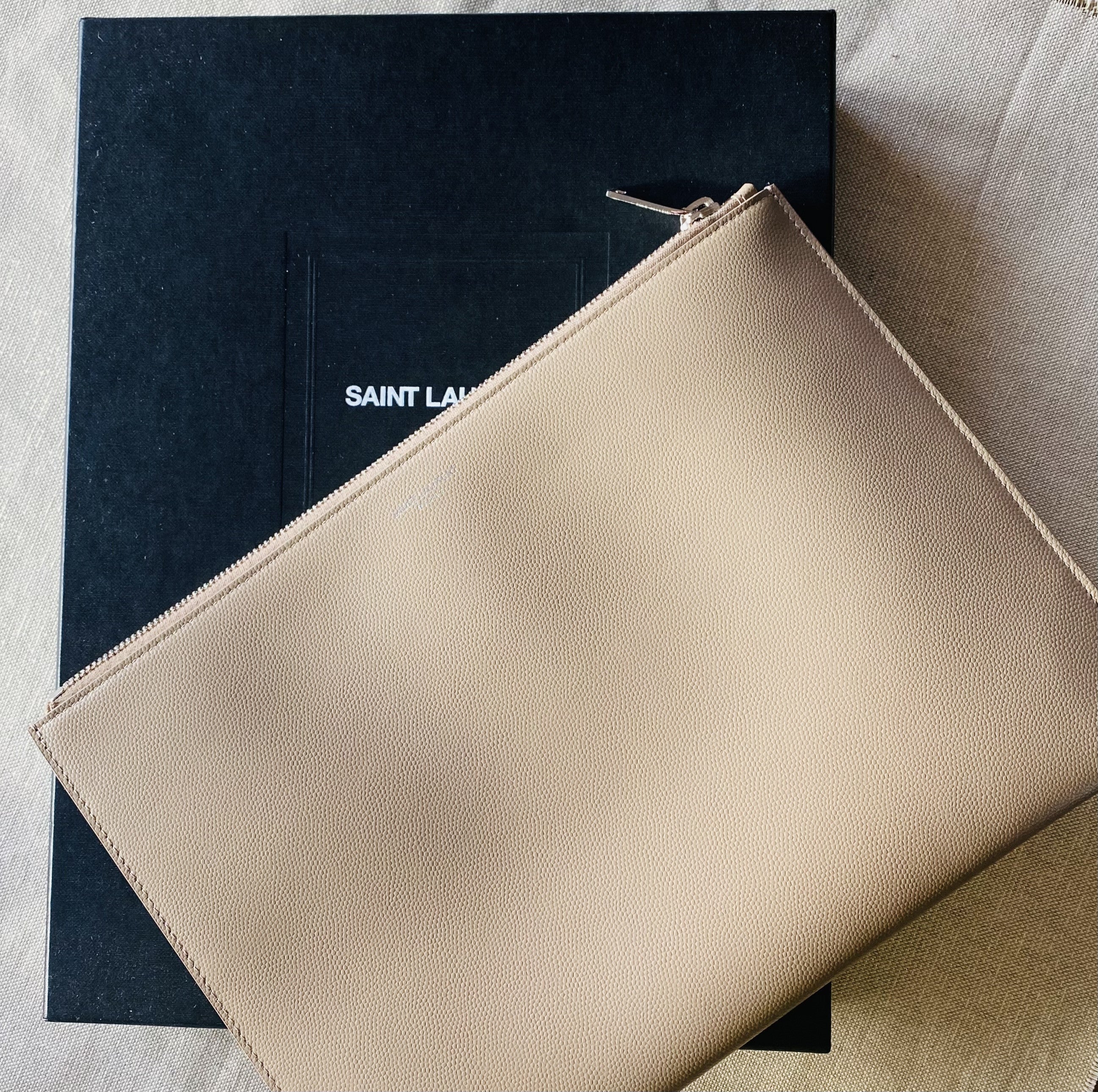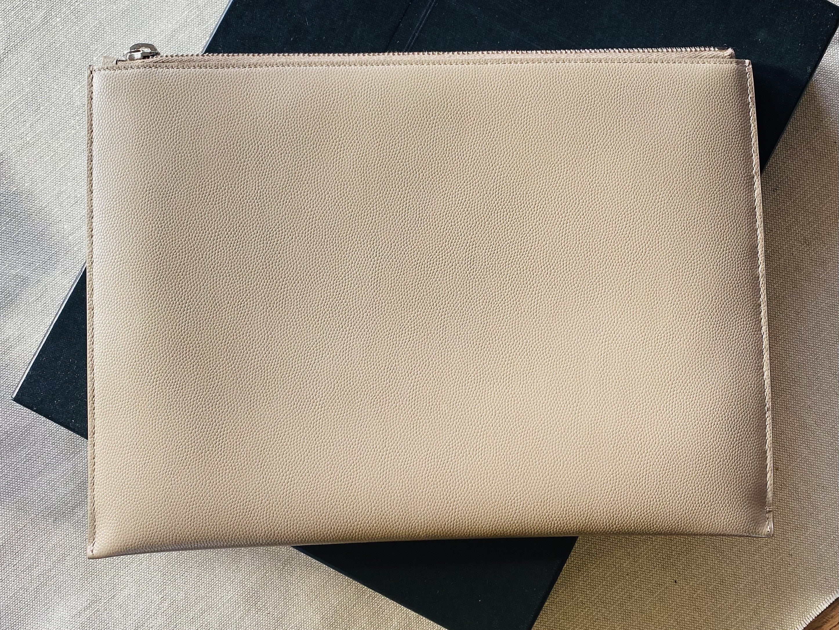 Pochette - porte document ou iPad en cuir grain poudrée beige , en excellent état . Détail en métal argenté , fermeture zippee . A l’intérieur un compartiment central, six fentes à cartes , deux poches plaquées .