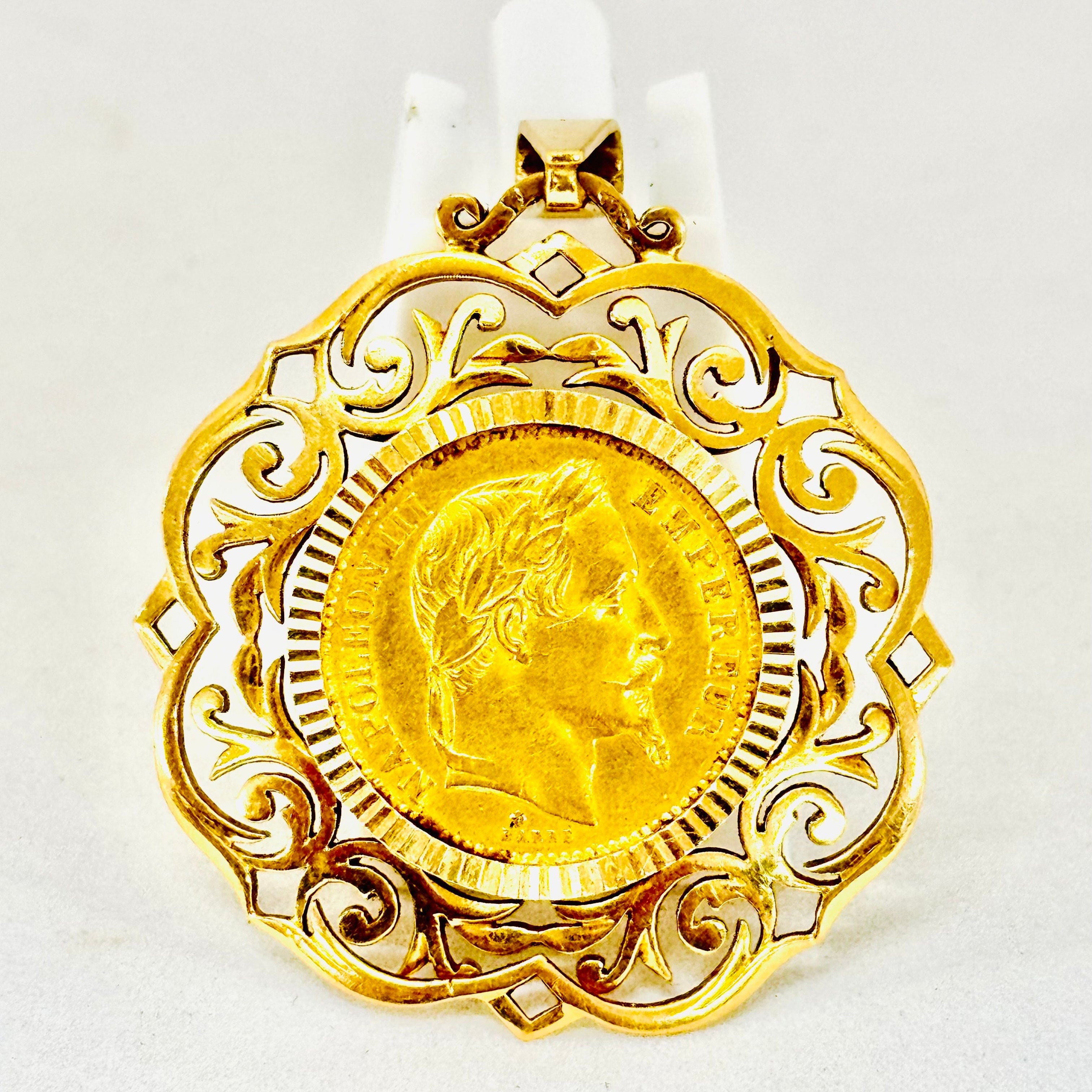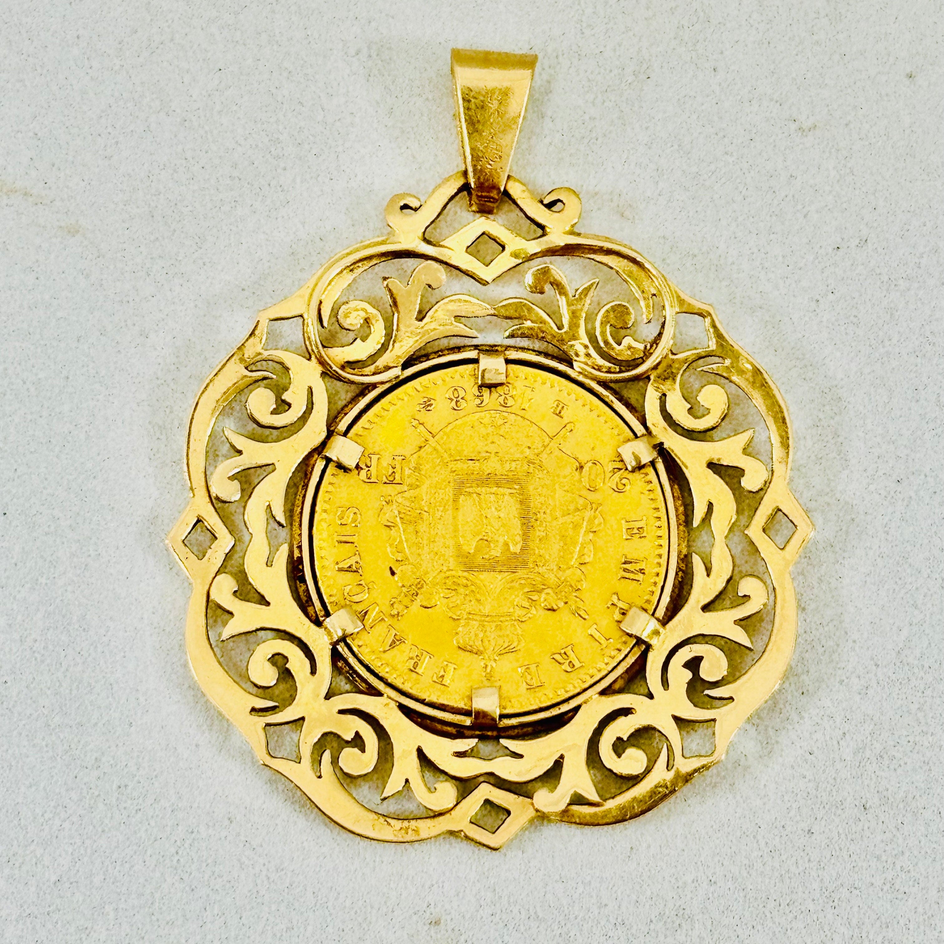 Pendentif porte-pièce en or jaune 750/1000 (18 carats), poinçon Tête d’Aigle, poids 13,99 g. Dimensions : 4,5 × 3,5 cm, épaisseur 4 mm. En bon état.