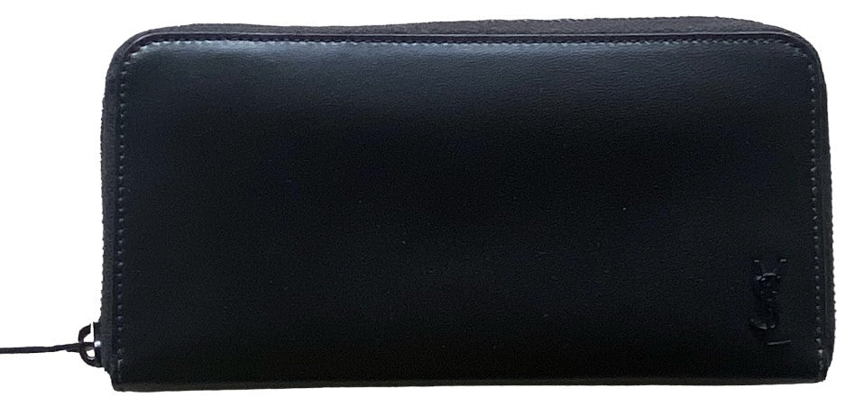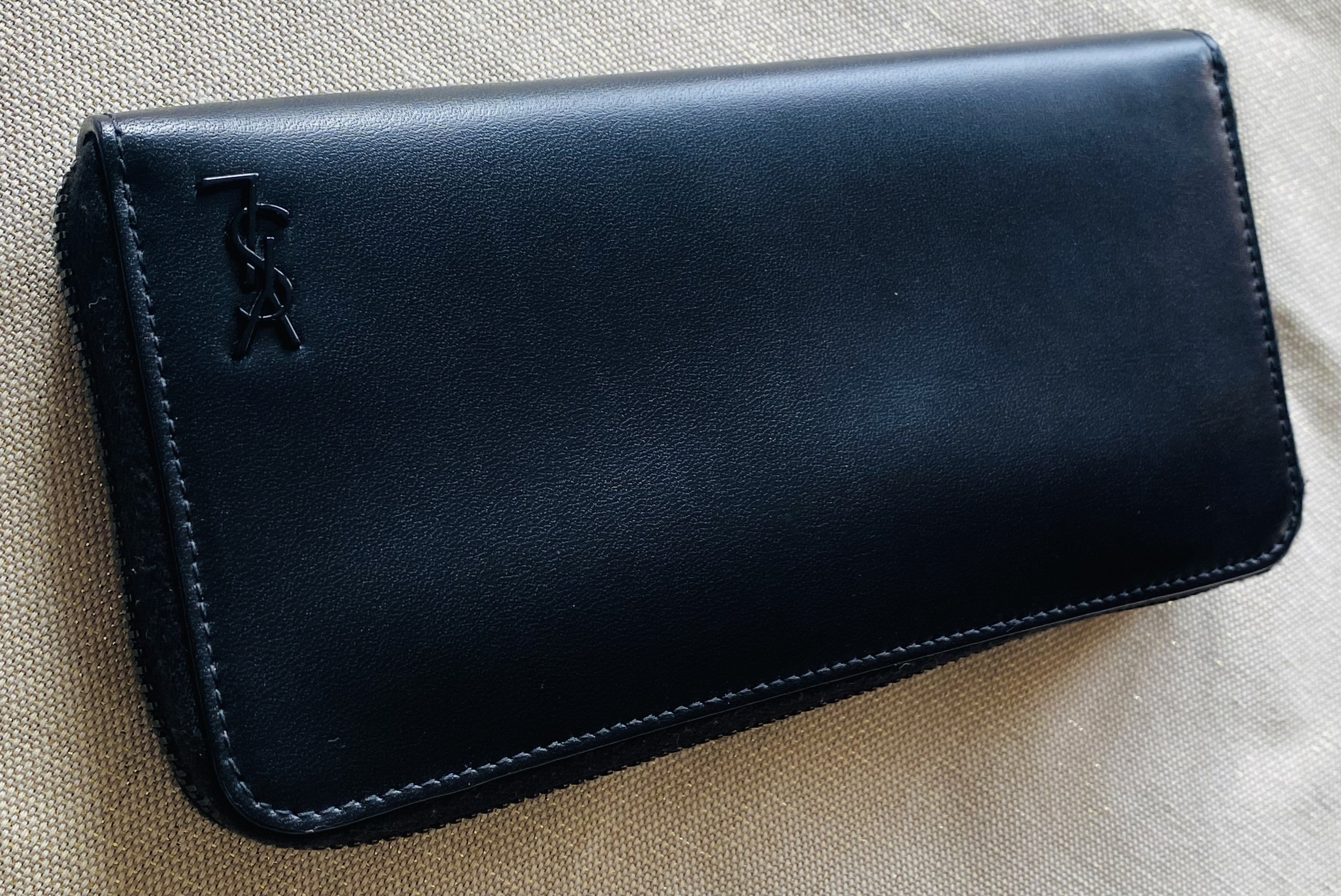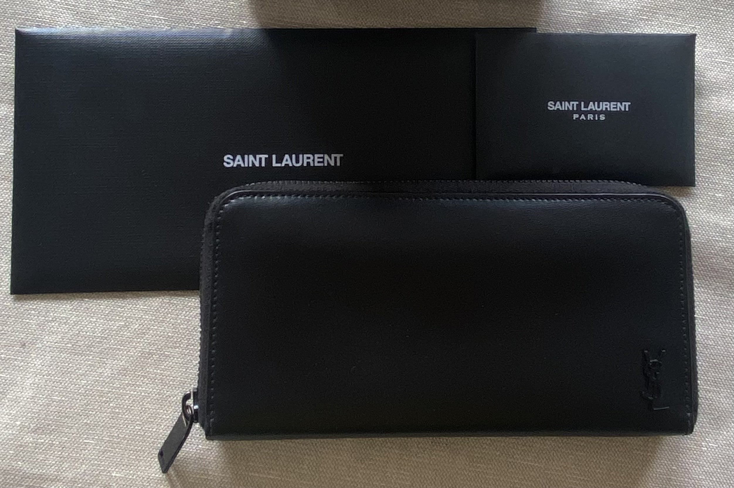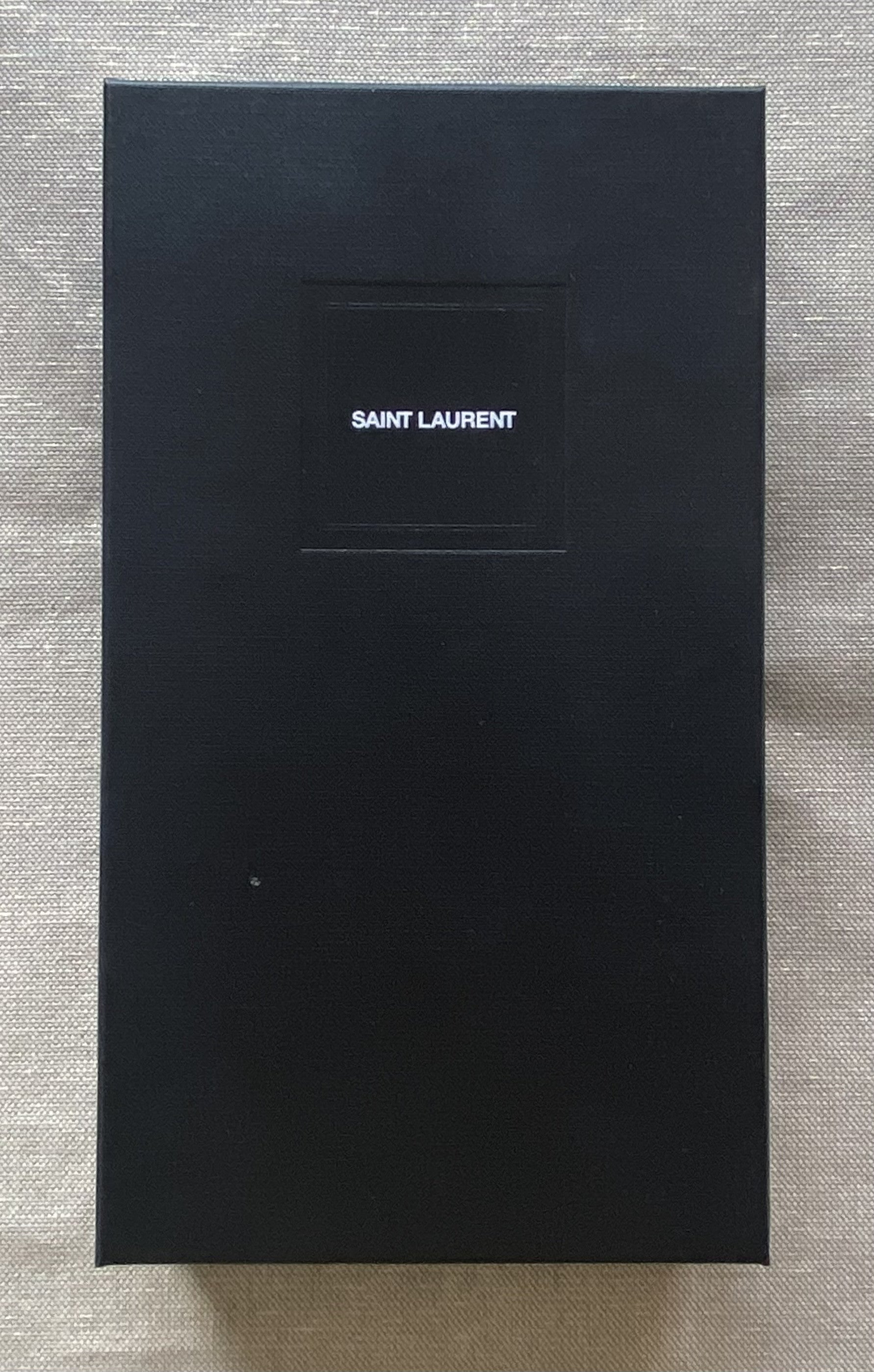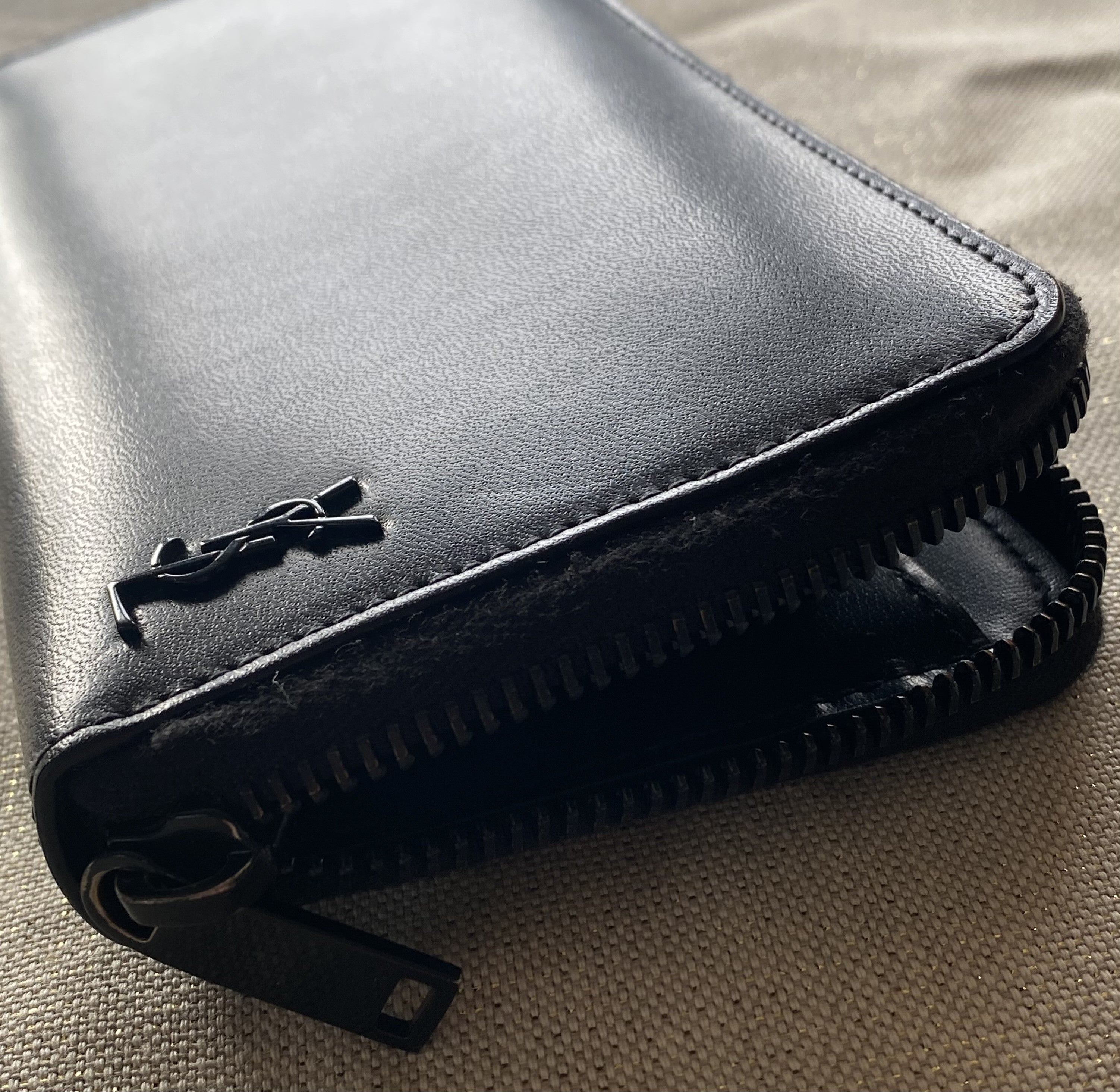 Portefeuille YSL Tiny Cassandre , vendu avec la boîte . A l’intérieur : deux compartiment principaux , deux compartiment pour les billets , douze fentes à cartes , une poche zippee pour la monnaie . 100% cuir de veau