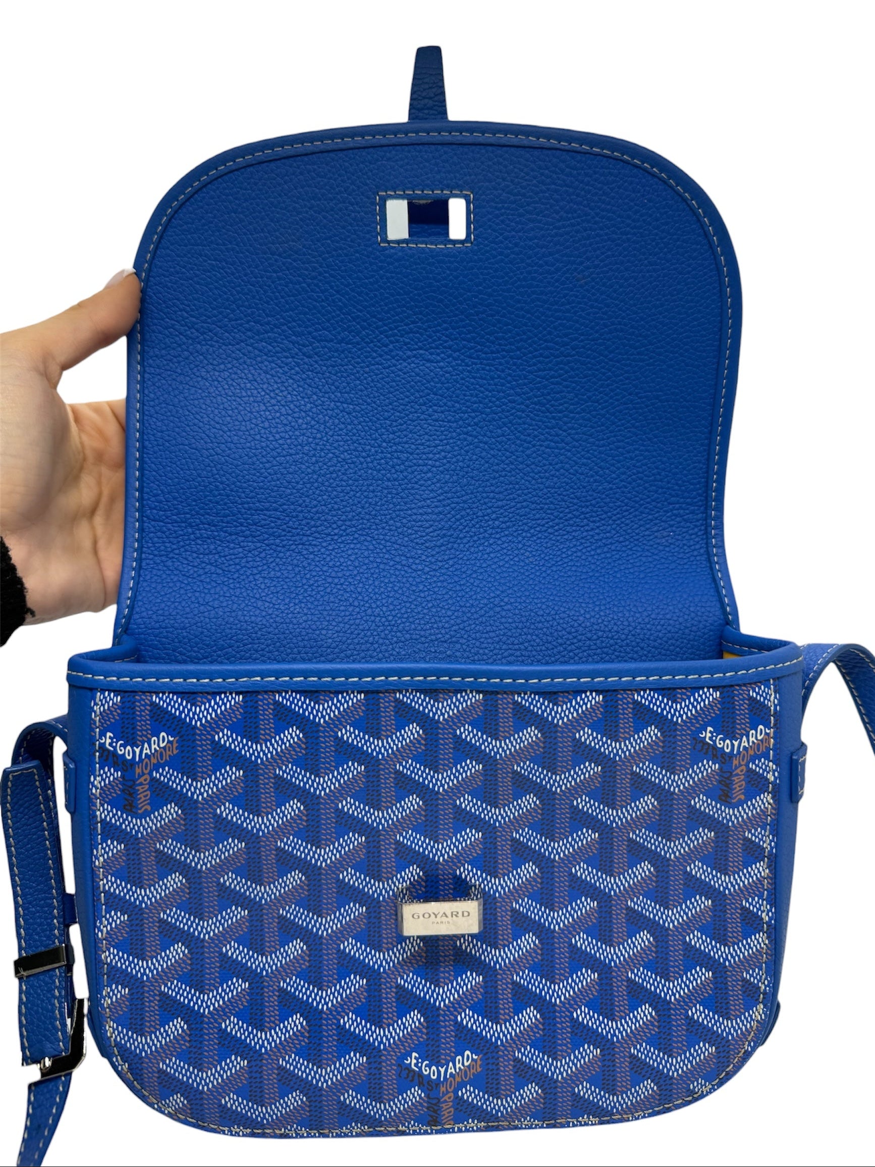 Sac à main Goyard Belvédère en finition bleue, porté bandoulière, avec dust bag et facture. Dimensions : 21 × 17 × 7 cm.