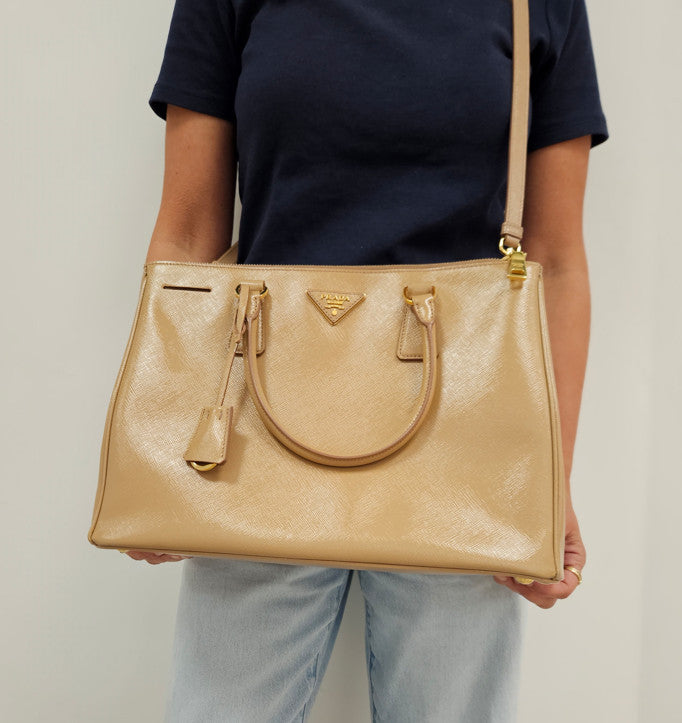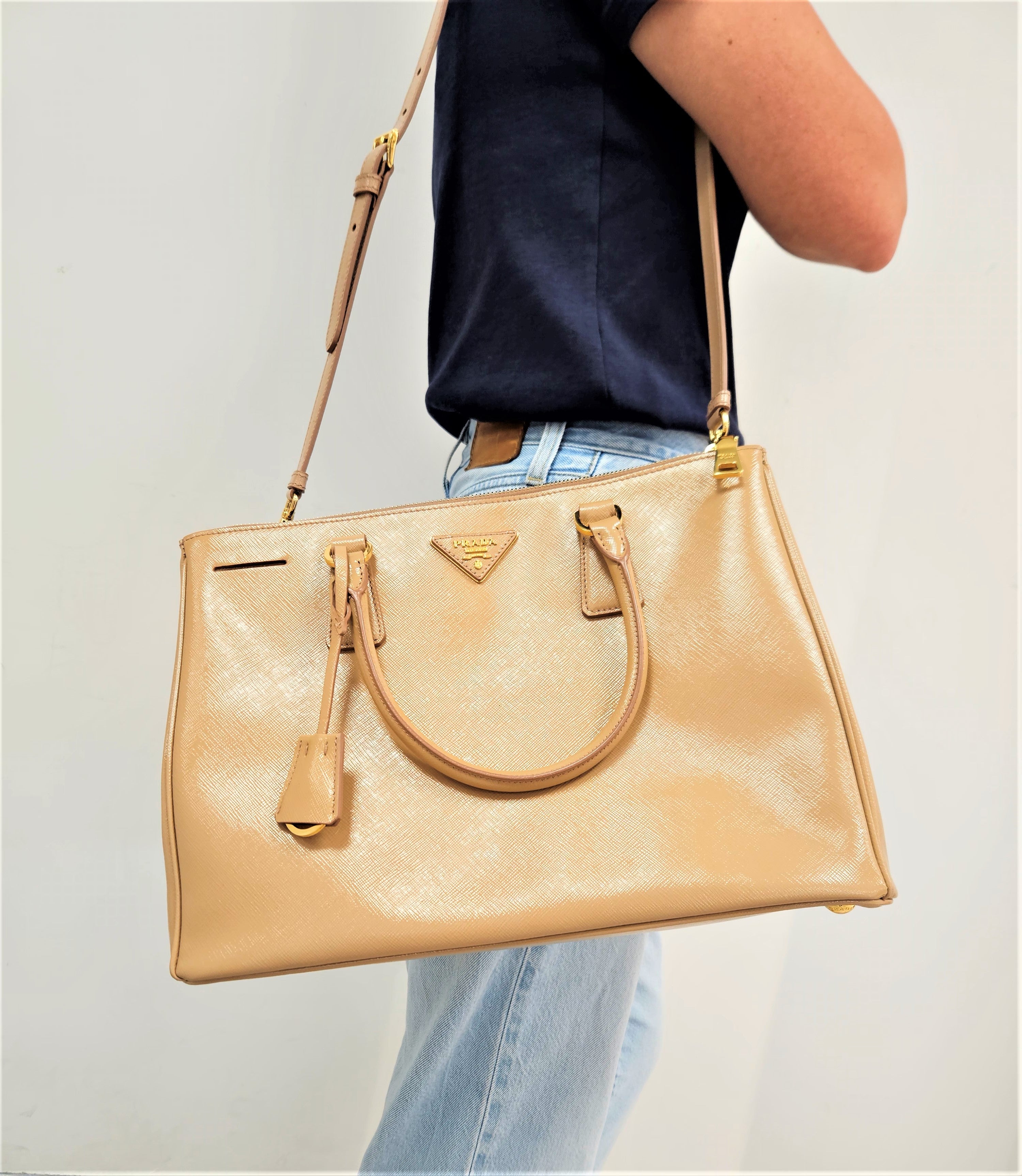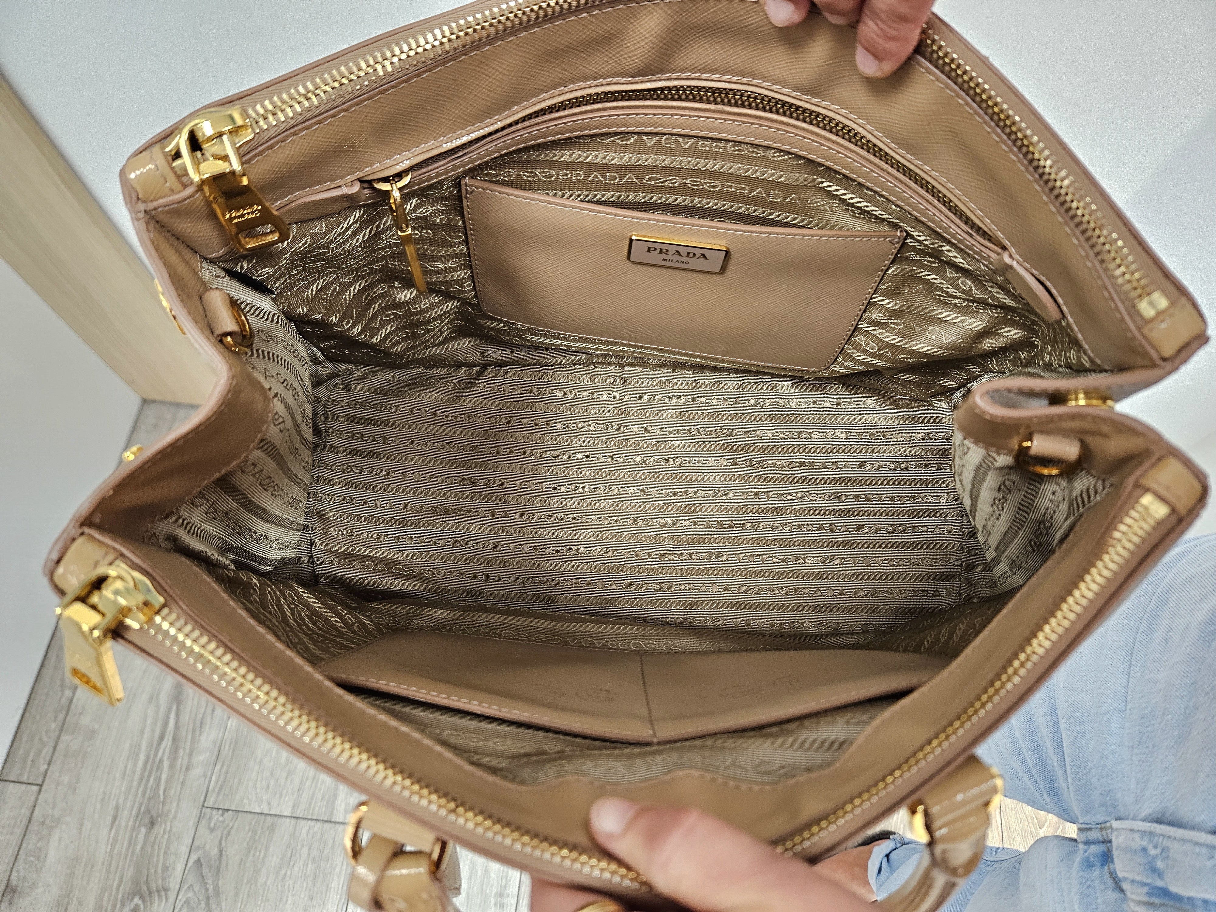 Fournis avec : Dust Bag et certificat Ravissant sac à main Prada saffiano vernis cameo- Anses en cuir pour porté main- Bandoulière amovible et ajustable en cuir, longueur 103 cm pour porté épaule- Trois Poches intérieur zippées- Ornements en métal- Triangle en cuir avec logo lettres en métal sur le devant- Boutons-pression sur les côtés- Doublure en nylon avec imprimé logo dotée de quatre poches, dont trois zippée- Pieds sur la base- quelques légères tâches sur poches internes d'encre et au verso de la bandoulière.