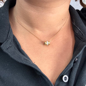 Pendentif de type charms est réalisé en or jaune et or blanc 18 carats (titrage 750/1000), avec un poinçon tête d’aigle ou sans poinçon. Il pèse 1,93 gramme et mesure 0,9 cm de hauteur, 6,2 mm de largeur et 1,5 mm d’épaisseur. Il est orné de quatre éclats de diamants et est en bon état.