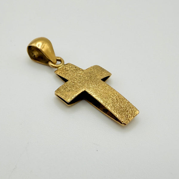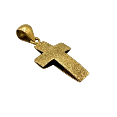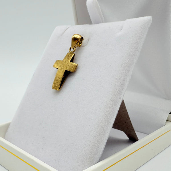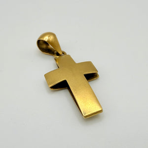Pendentif en forme de croix en or jaune 18 carats (750/1000), poinçonné Tête d’Aigle. Il mesure 3 cm de hauteur, 1,5 cm de largeur et 0,5 cm d’épaisseur, pour un poids de 1,97 gramme. Sans pierres, ce bijou sobre et symbolique est en bon état.