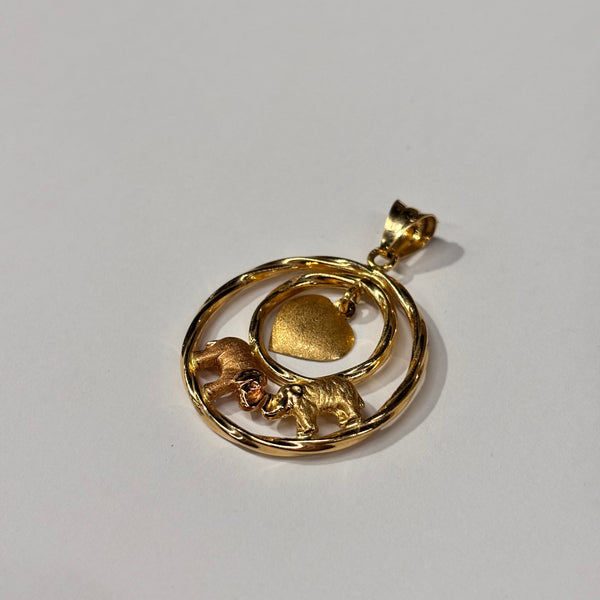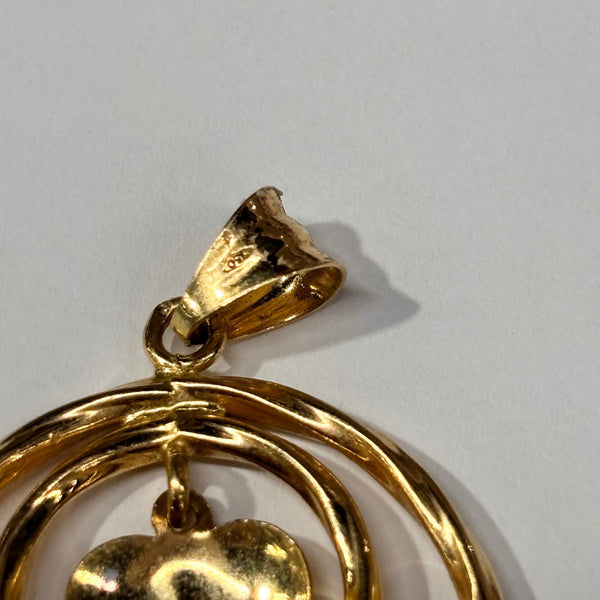 Pendentif symbolique en or jaune et or rose 18 carats (750/1000), poinçonné "750". Il pèse 3,29 grammes et mesure 3 cm de hauteur et de largeur, avec une épaisseur fine de 0,1 mm. Ce modèle sans pierres se distingue par son design épuré et son élégance discrète. L’ensemble est en très bon état.
