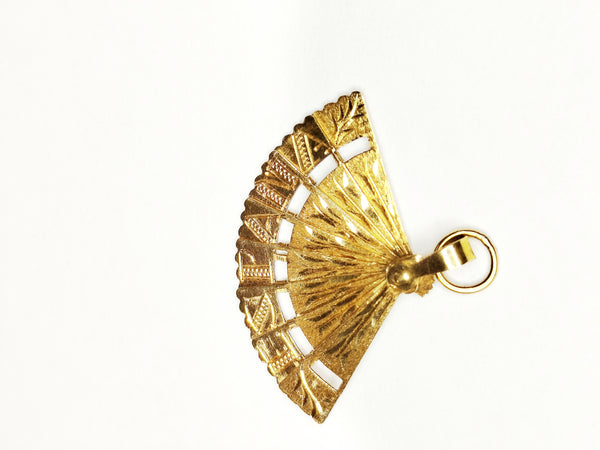 Pendentif en forme d’éventail en or jaune 18 carats (750/1000), sans poinçon. Il mesure 2,5 cm de hauteur et de largeur, avec une épaisseur fine de 0,1 cm, pour un poids de 1,68 gramme. Sans pierres, il séduit par son design délicat et raffiné. En très bon état.