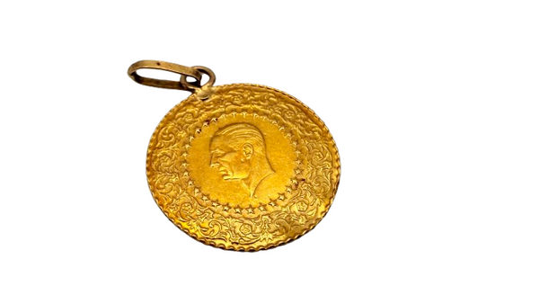 Pendentif de type médaille est en or jaune 18 carats (titrage 750/1000, poinçon 750). De forme ronde, il mesure 1,8 cm de hauteur et de largeur, avec une épaisseur de 0,1 cm, pour un poids de 1,88 gramme. Il se trouve en bon état.
