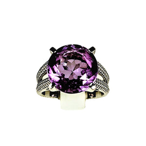 Pierre Améthyste de 11 mm de diamètre avec un pavage de 6 diamants de chaque côté du sertissage (environ 0.05 carat).