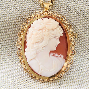 Pendentif - broche ancien en or jaune 18k serti à griffes orné d'un camée coquillage représentant le profil d'une jeune femme . Vendu sans chaîne .