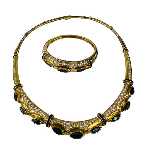 Belle parure semi rigide articulé en chute en or jaune 750/1000 serti de diamants brillantés et de saphir taille navette et calibrés