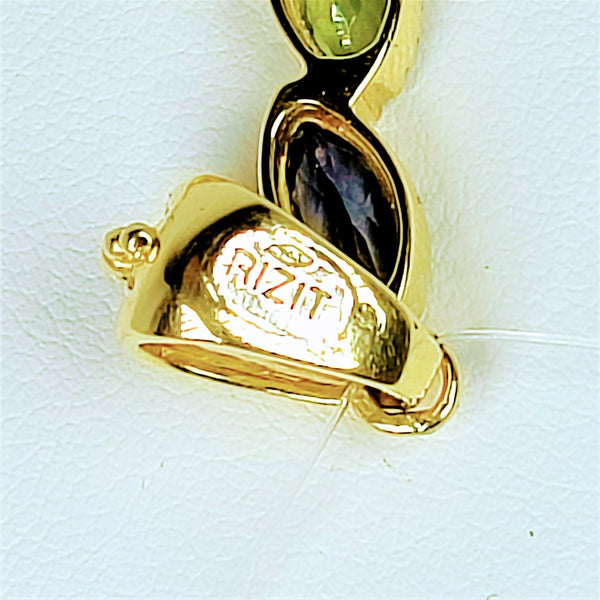Joli pendentif croix signé Rizit en or jaune 18k, serti clos perlé de pierres fines taille navette