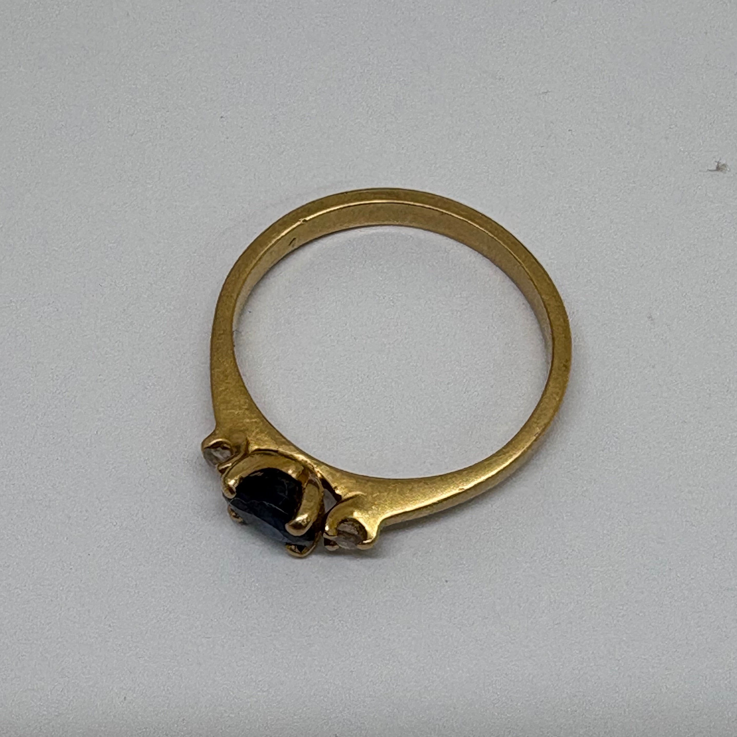 Cette bague empierrée en or jaune 18 carats (750/1000) associe la profondeur d’un saphir bleu marine à l’éclat de deux diamants finement sertis. Avec un poids de 2,06 g et une taille 47, elle offre un porté délicat et élégant. Le poinçon Tête d’Aigle garantit l’authenticité de l’or. En très bon état.