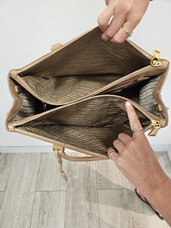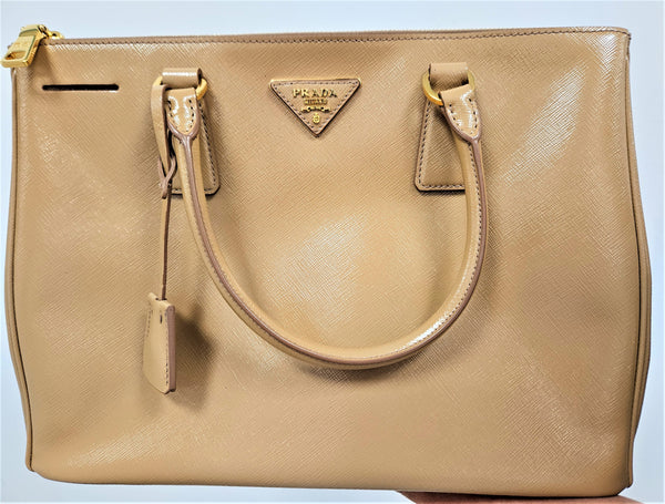 Fournis avec : Dust Bag et certificat Ravissant sac à main Prada saffiano vernis cameo- Anses en cuir pour porté main- Bandoulière amovible et ajustable en cuir, longueur 103 cm pour porté épaule- Trois Poches intérieur zippées- Ornements en métal- Triangle en cuir avec logo lettres en métal sur le devant- Boutons-pression sur les côtés- Doublure en nylon avec imprimé logo dotée de quatre poches, dont trois zippée- Pieds sur la base- quelques légères tâches sur poches internes d'encre et au verso de la bandoulière.