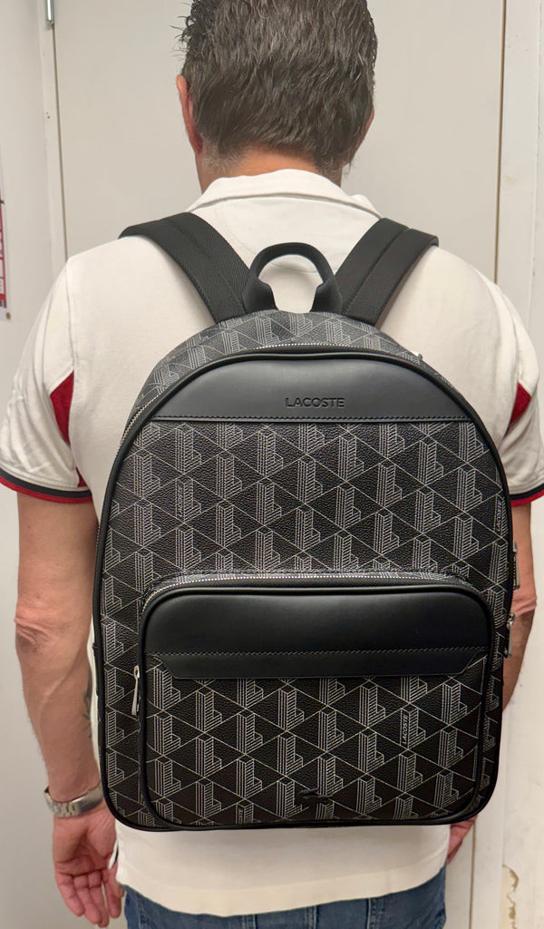 Sac à dos Lacoste modèle The Blend arbore un design élégant en finition monogram noir et gris, confectionné en PVC résistant. De forme classique, il se distingue par un marquage Lacoste embossé et un crocodile ton sur ton, subtil et sophistiqué. Mesurant 40 cm de hauteur, 30 cm de largeur et 13,5 cm de profondeur, il est en excellent état, comme neuf.