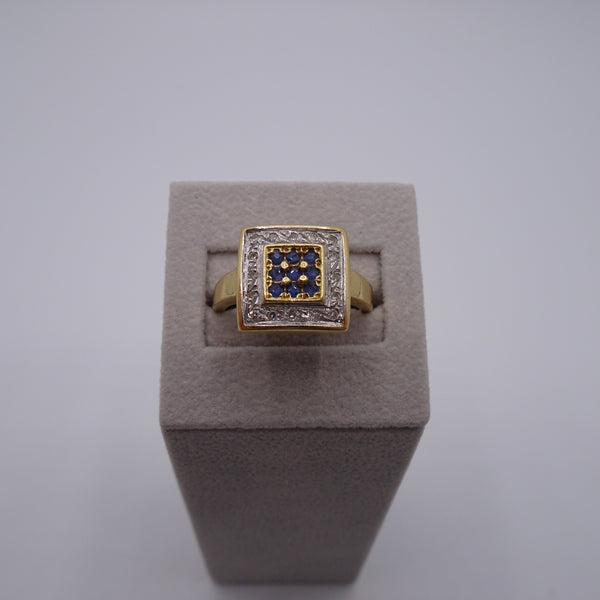 Bague en or jaune 750/1000 (18 carats), poinçon tête d’aigle. Sertie de 9 saphirs d’environ 0,018 ct chacun et de 16 diamants de 0,03 ct. Taille 59, poids : 6,87 g. En très bon état.