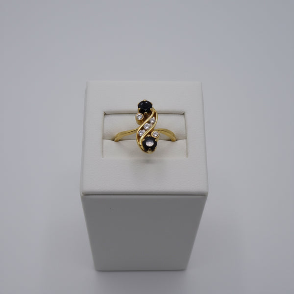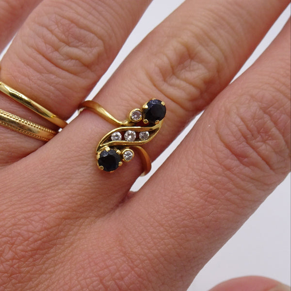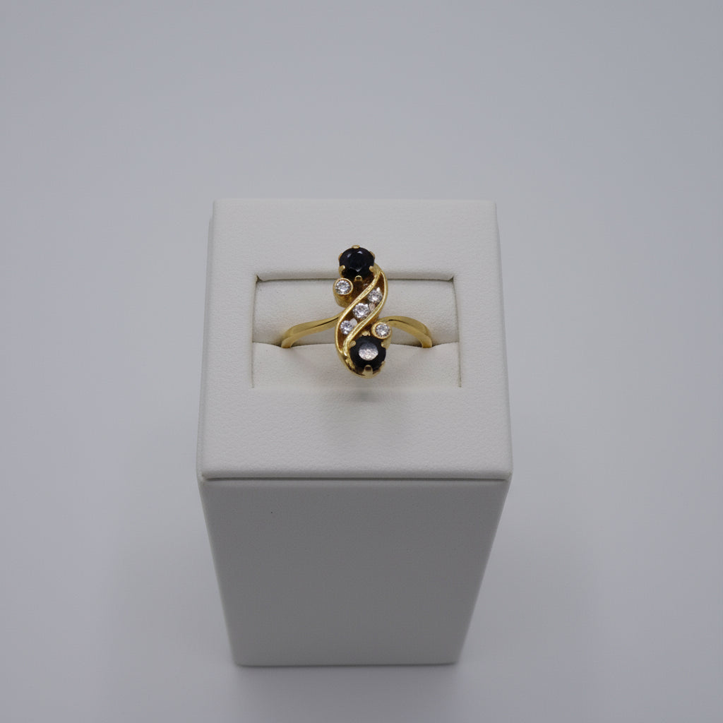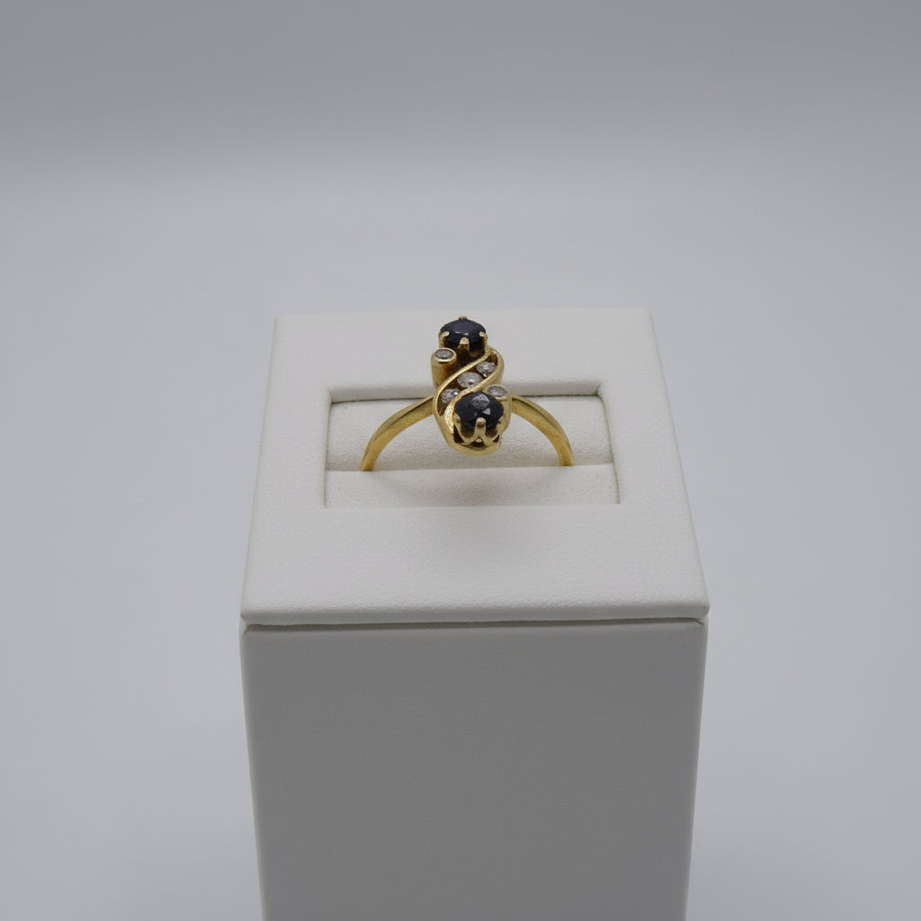 Bague en or jaune 750/1000 (18 carats), poinçon tête d’aigle. Sertie de 2 saphirs (0,09 ct chacun) et de 5 diamants (0,014 ct). Taille 52, poids : 2,56 g. En très bon état.