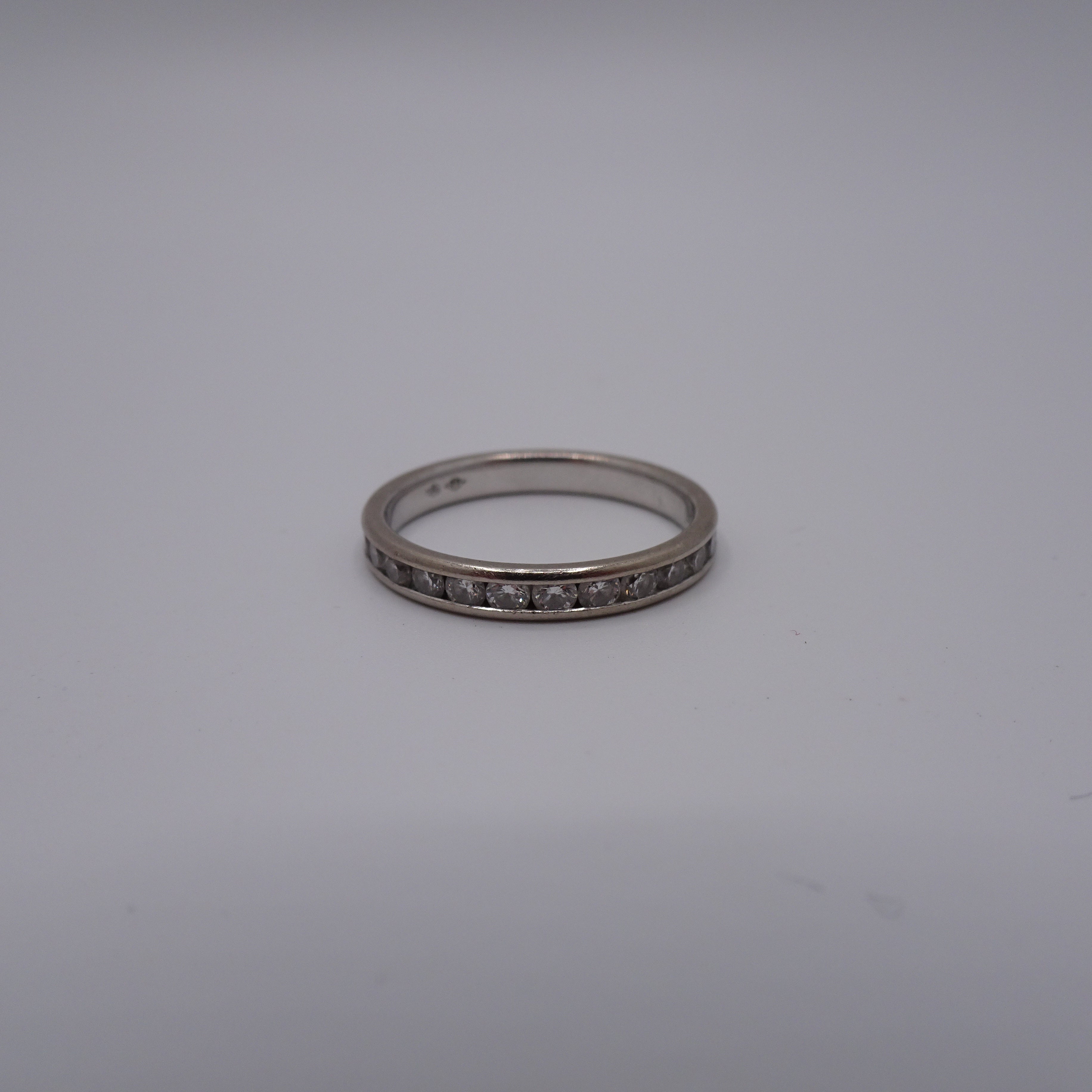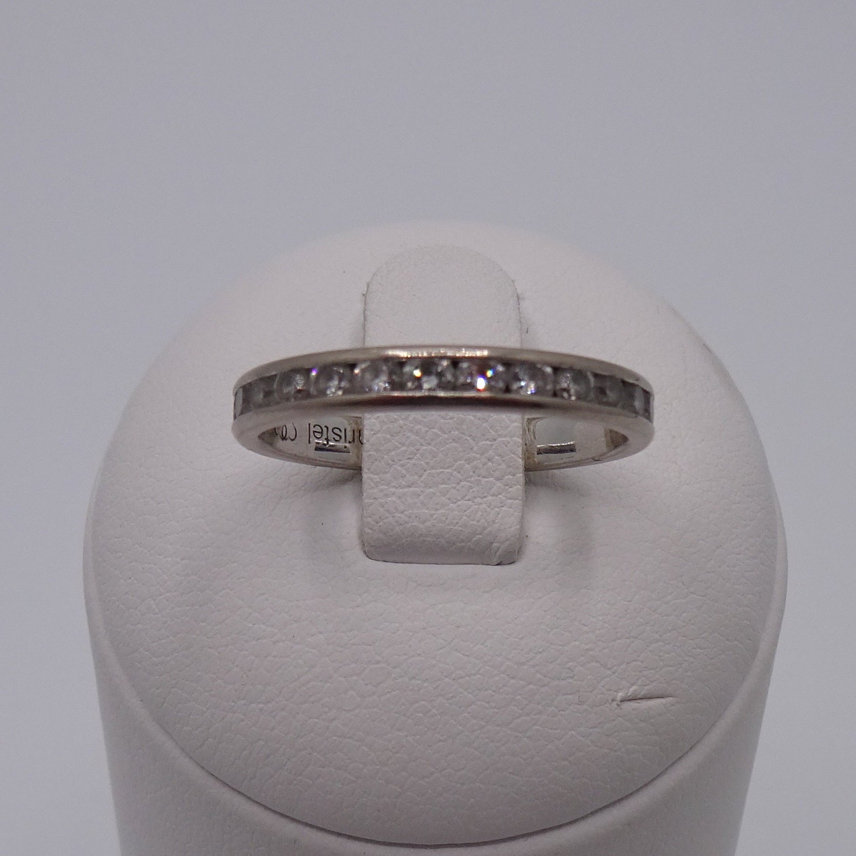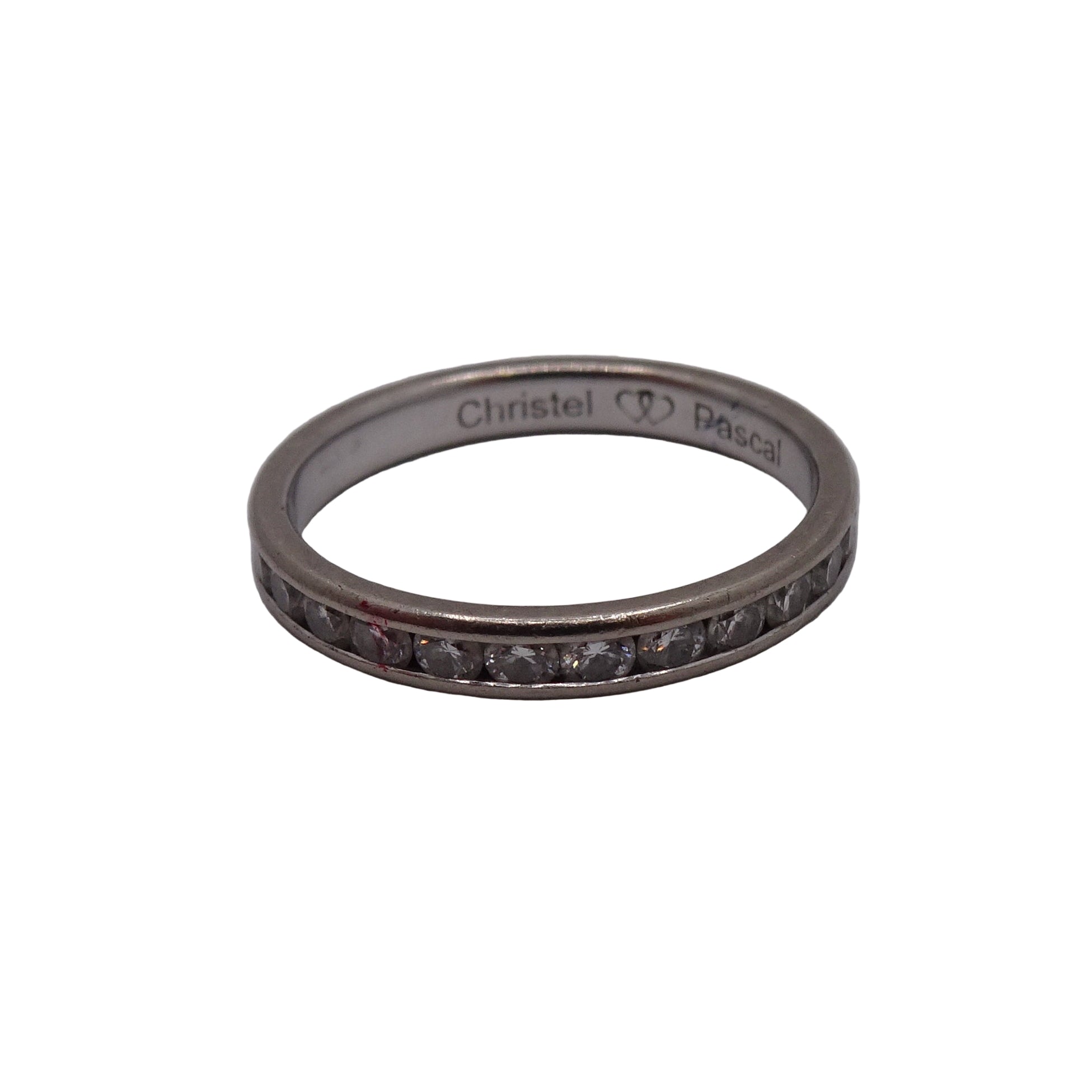 Alliance en or blanc 18 carats (750/1000, poinçon tête d’aigle), sertie de 28 diamants taille brillant pour un total de 1,25 carat. Poids : 2,33 g, état : très bon. Un bijou raffiné et lumineux, symbole d’élégance et de pureté, idéal pour une alliance ou un bijou de tous les jours.