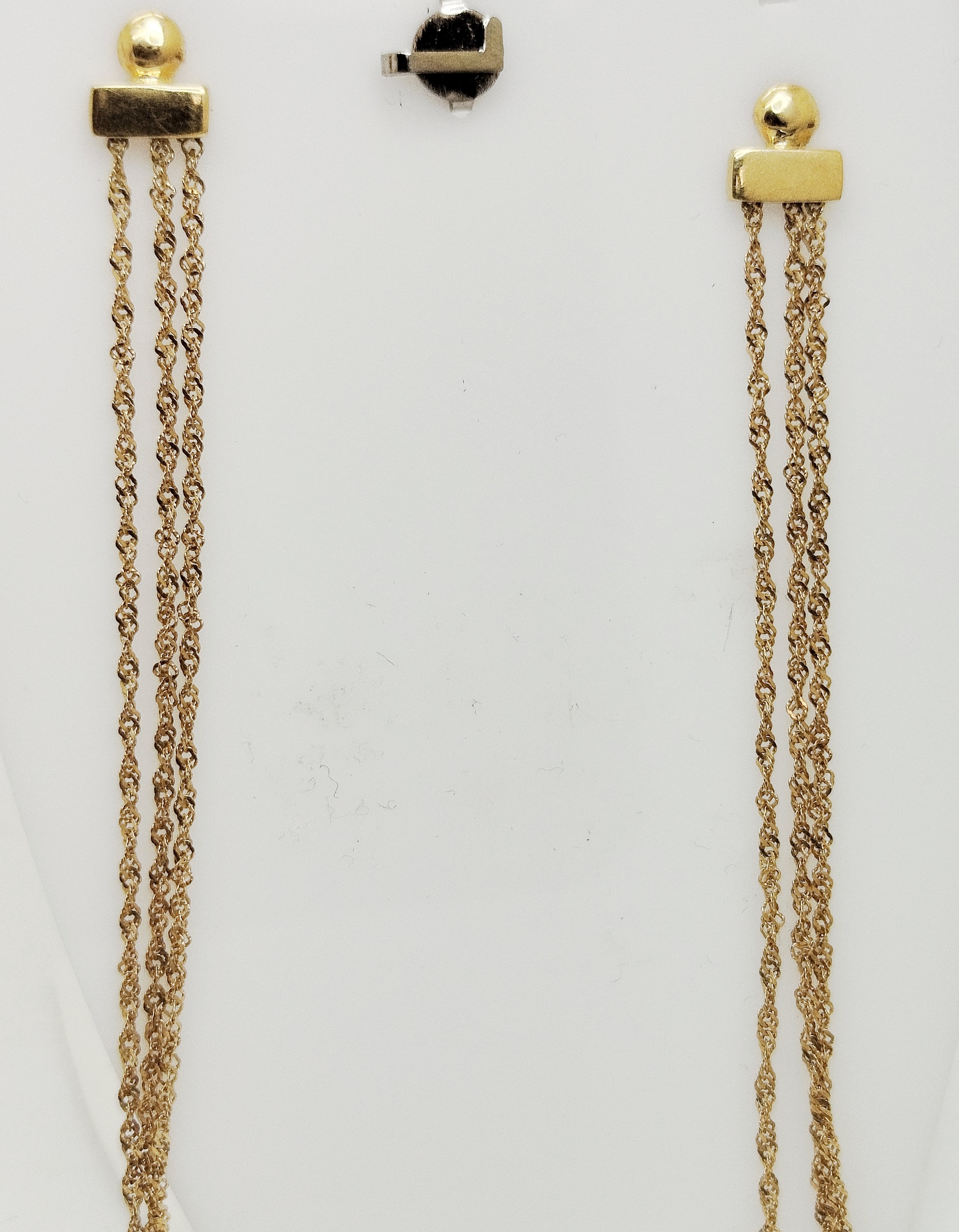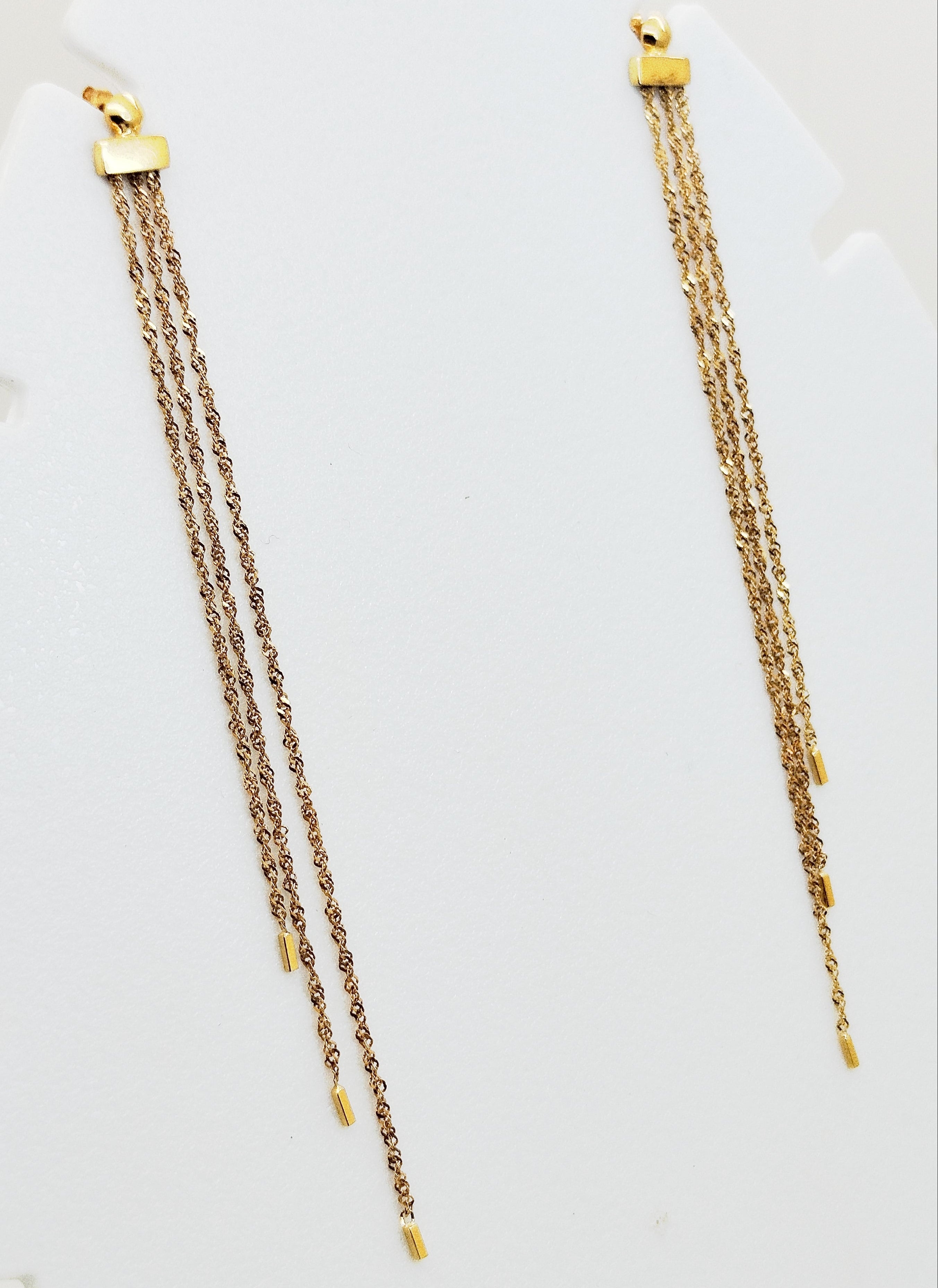 Boucles pendantes en or jaune 750/1000 (18 carats), poinçon 750. Fermoirs mixtes poussettes et crochets. Dimensions : 10,5 × 0,2 × 0,2 cm. Poids total : 2,94 g. En très bon état.
