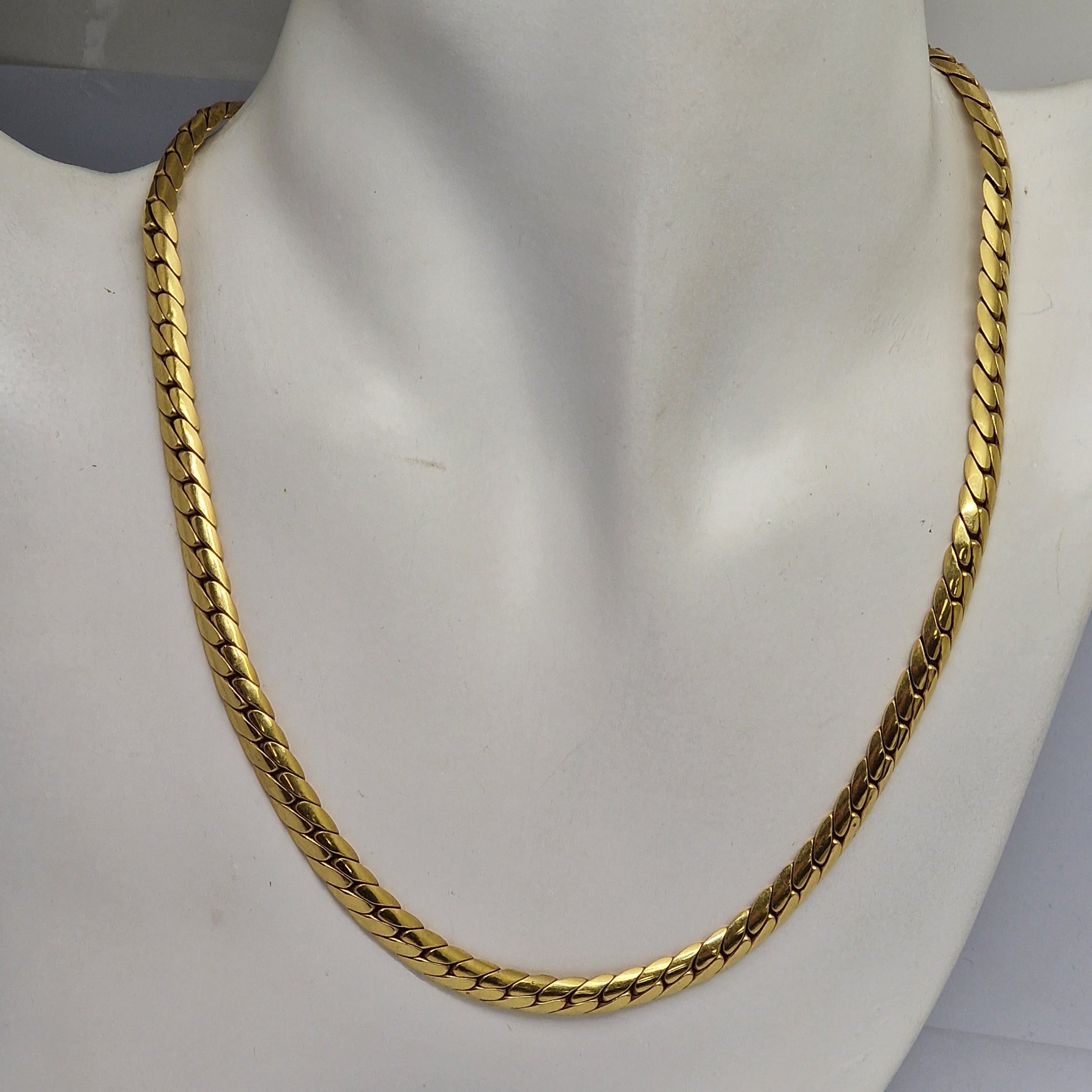 Collier ras du cou en or jaune 18 carats (750/1000) à maille anglaise, muni d’un fermoir à cliquet et portant le poinçon tête d’aigle. Il pèse 16,95 grammes, mesure 43,2 cm de longueur et se trouve en bon état.