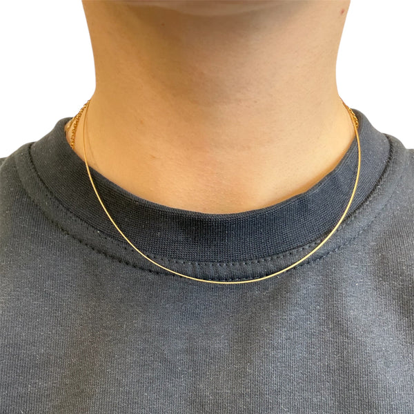 Collier ras du cou en or jaune 18 carats (750/1000), avec maille serpent et fermoir à anneau ressort. Longueur : 39 cm, largeur et épaisseur : 1 mm, poids : 1,11 g, état : très bon. Un bijou fin et discret, idéal à porter seul ou accompagné d’un pendentif.