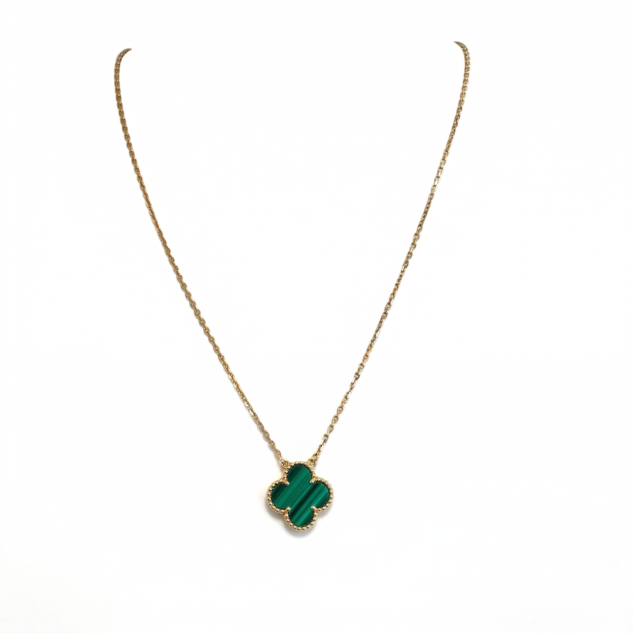 Collier princesse en or jaune 18 carats (750/1000) à maille cheval, sublimé par une pierre de malachite naturelle. Longueur 47 cm, poids 5,6 g, offrant finesse et élégance au quotidien. Fermoir mousqueton sécurisé, poinçon Au750, en très bon état.