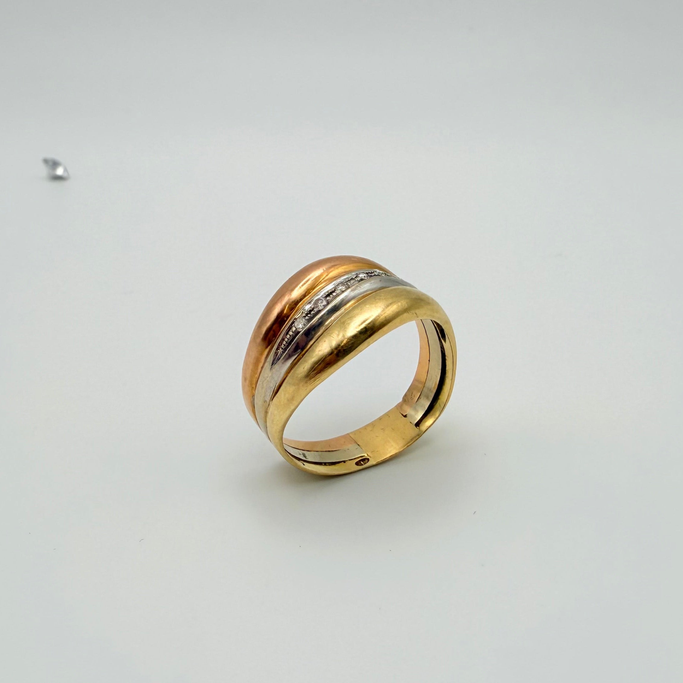Alliance en or jaune, gris et rose 18 carats (750/1000), poinçonnée 750. D’un poids de 5,69 grammes et d’une taille 62, elle se distingue par son design tricolore raffiné, sans pierres. En bon état général.
