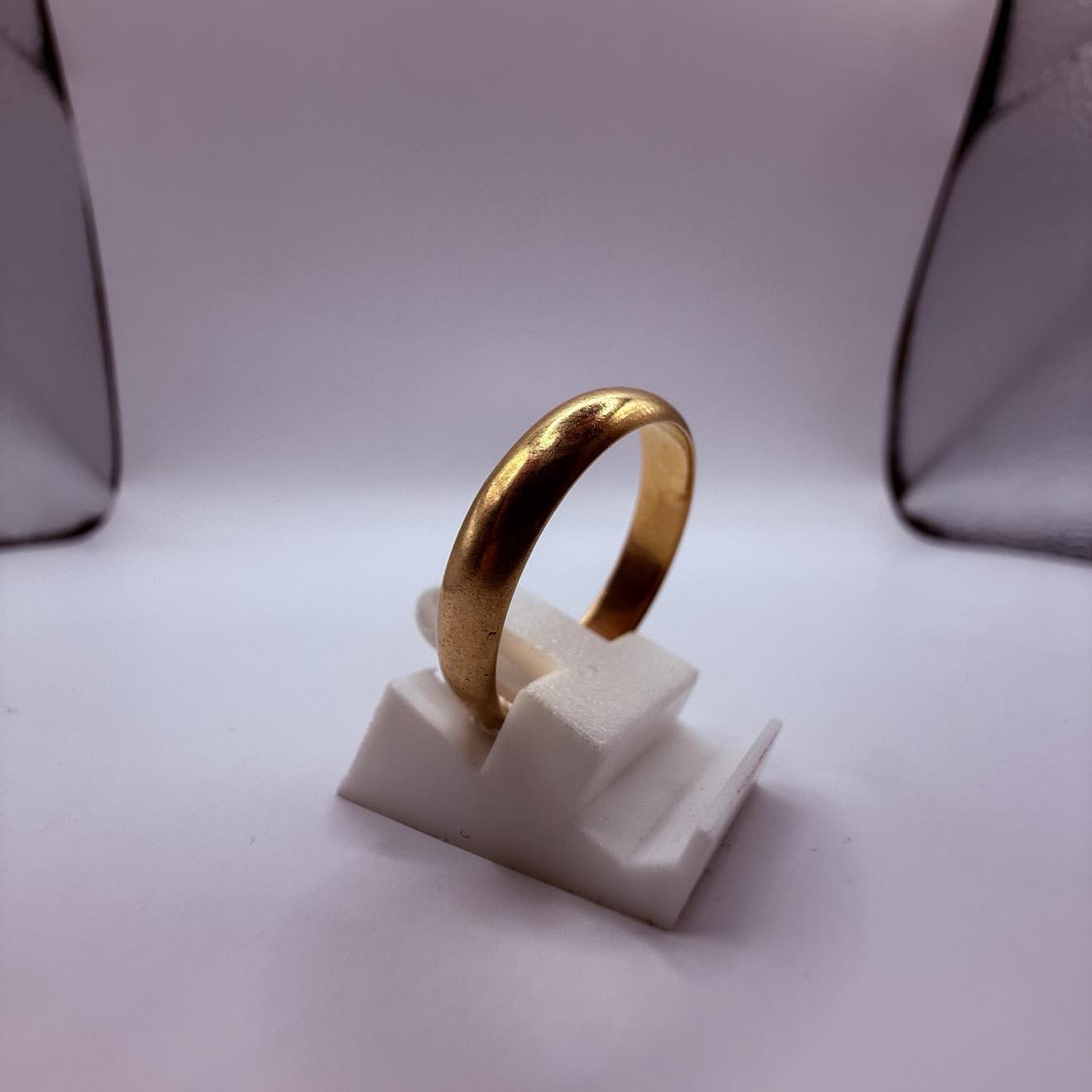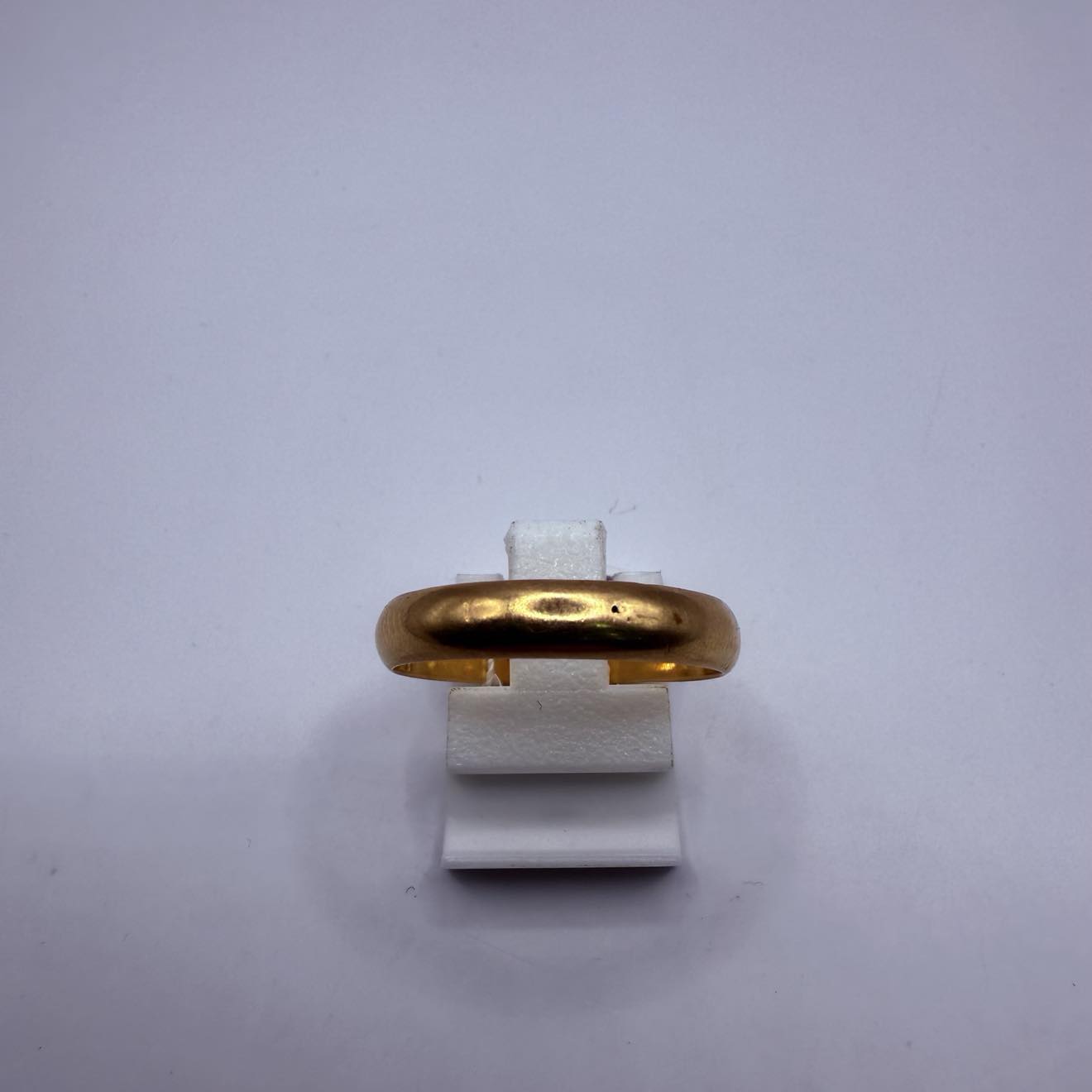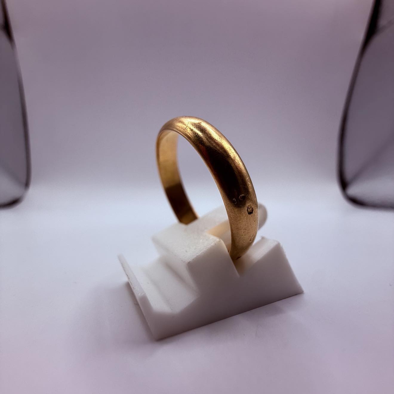 Alliance en bon état en or jaune 18 carats (750/1000), poinçonnée Tête d’Aigle, d’un poids de 3,66 grammes et de taille 60. Ce modèle épuré, sans pierres, incarne la sobriété et l’élégance intemporelle. Elle est en bon état général.