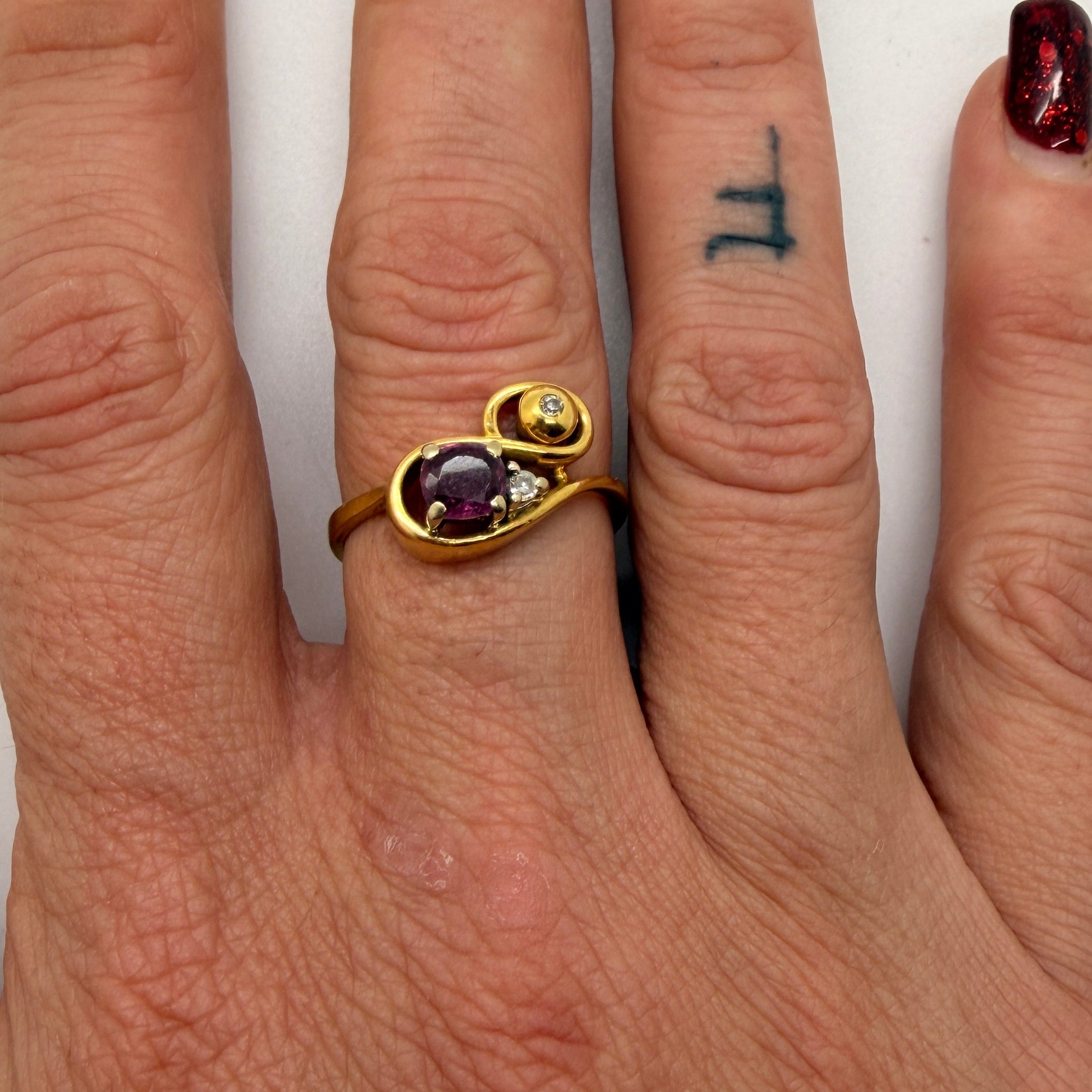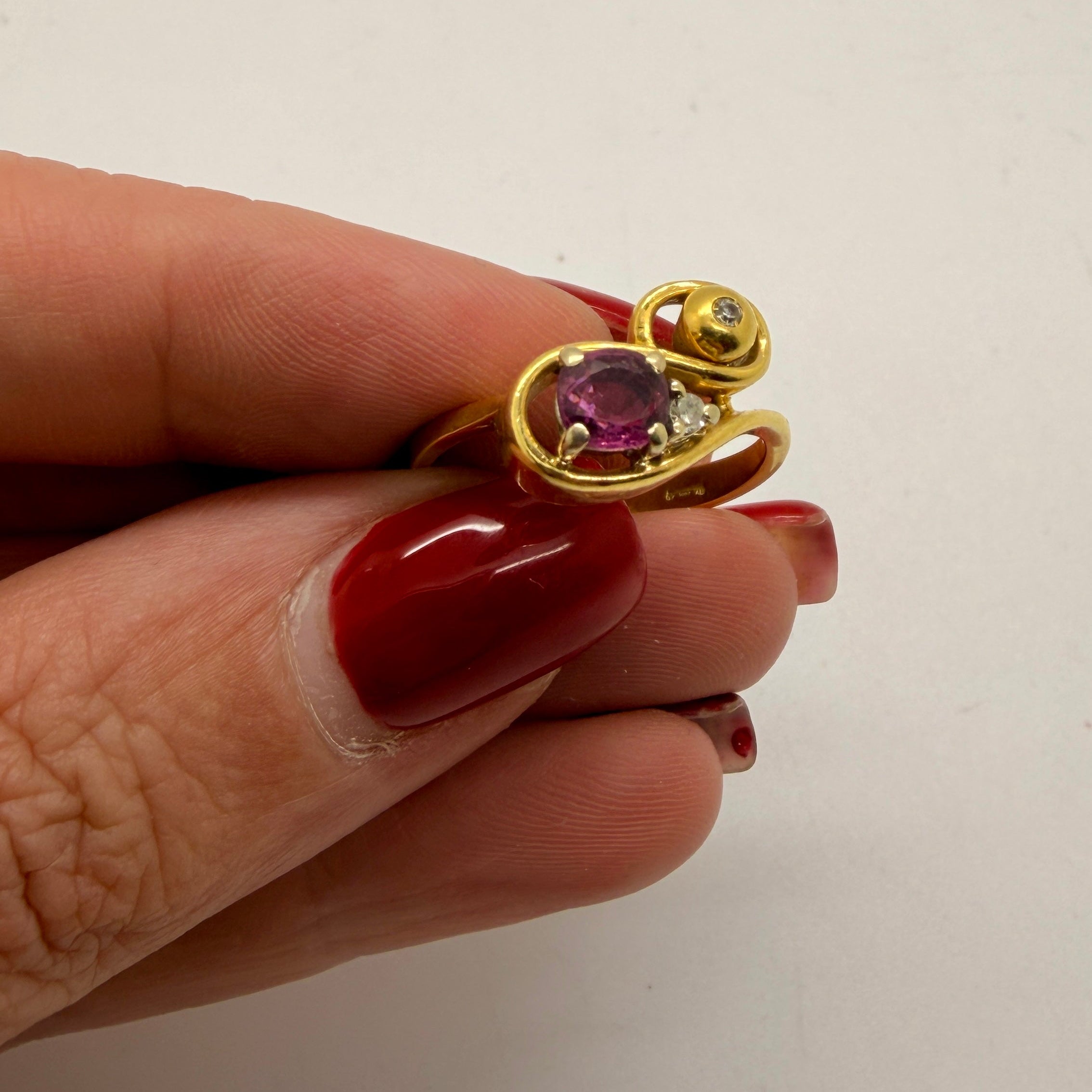 Bague empierrée en or jaune 18 carats (750/1000), poinçon 750. Poids : 5,10 g · Taille : 56. Sertie d’oxydes de zirconium et d’une améthyste. État : très bon état.