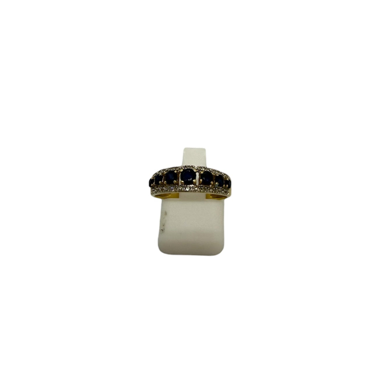 Bague demi-tour empierrée en or jaune et blanc 18 carats (750/1000), taille 51, poids 2,66 g. Sertie de 7 saphirs et 14 diamants (0,01 ct chacun), très bon état, élégante et raffinée.