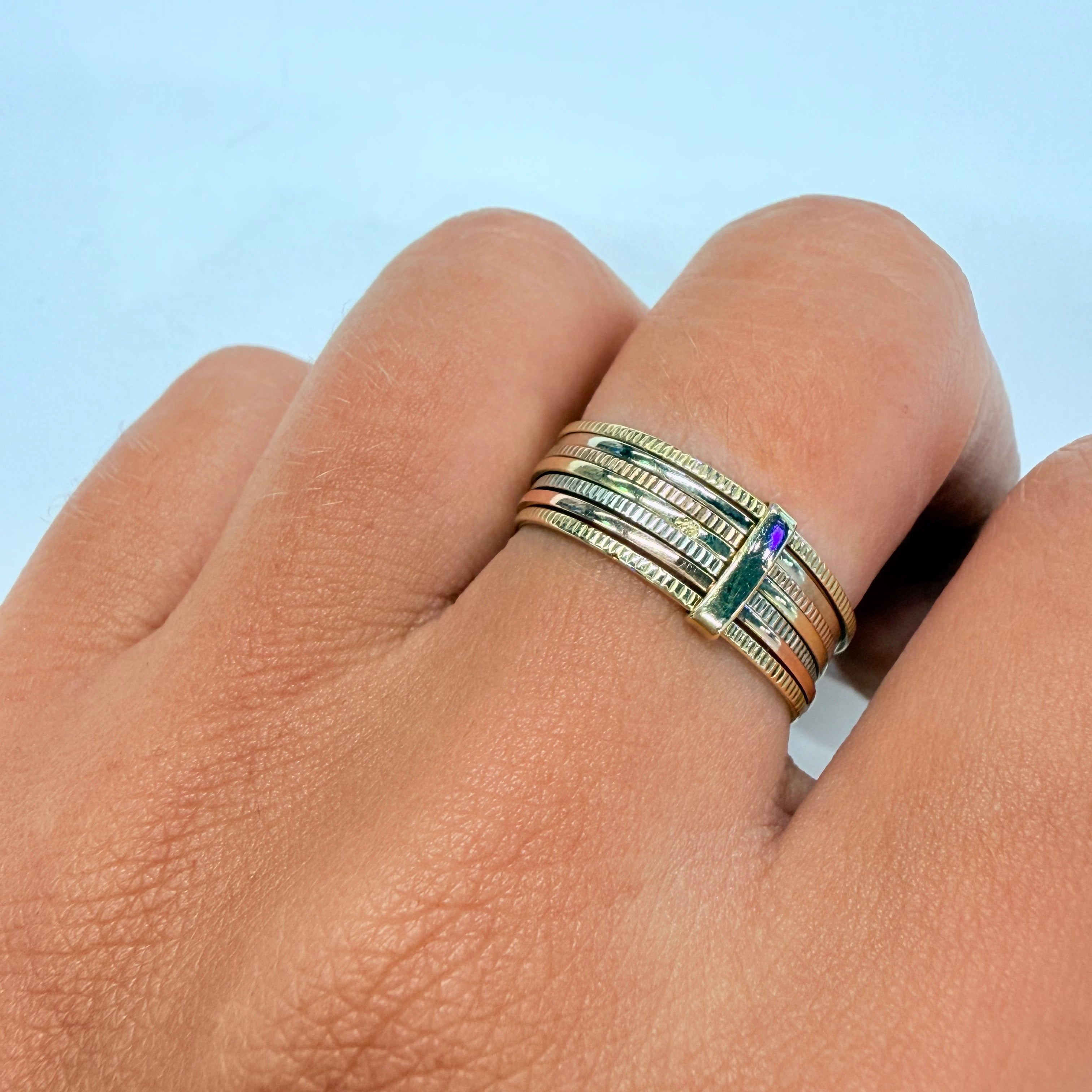 Bague semainier en or jaune, or rose et or blanc 18 carats (750/1000), poinçon 750. Poids : 3,43 g ; taille : 57. Sans pierres. État : très bon état.