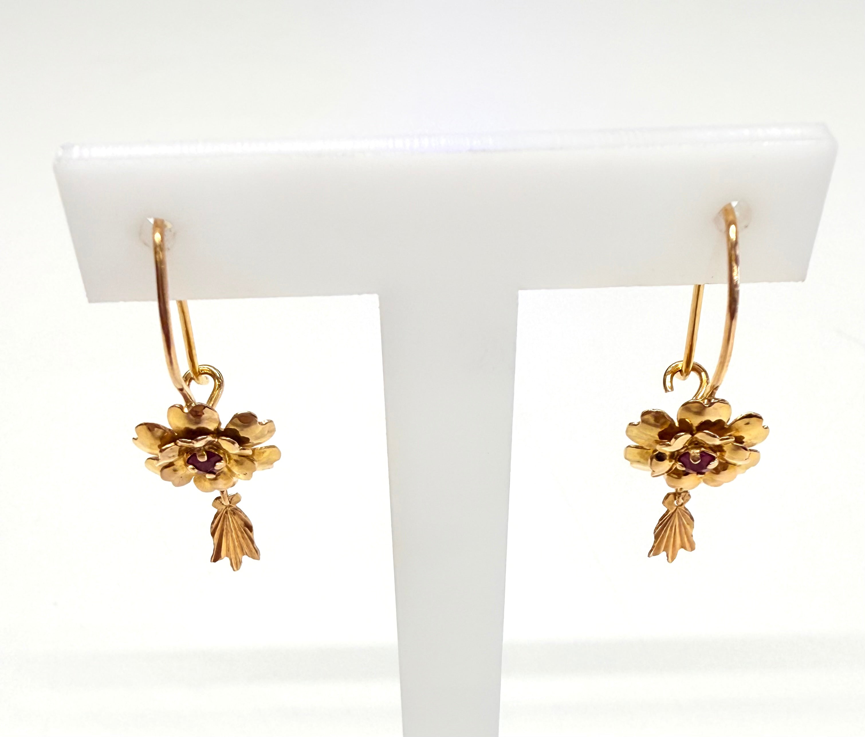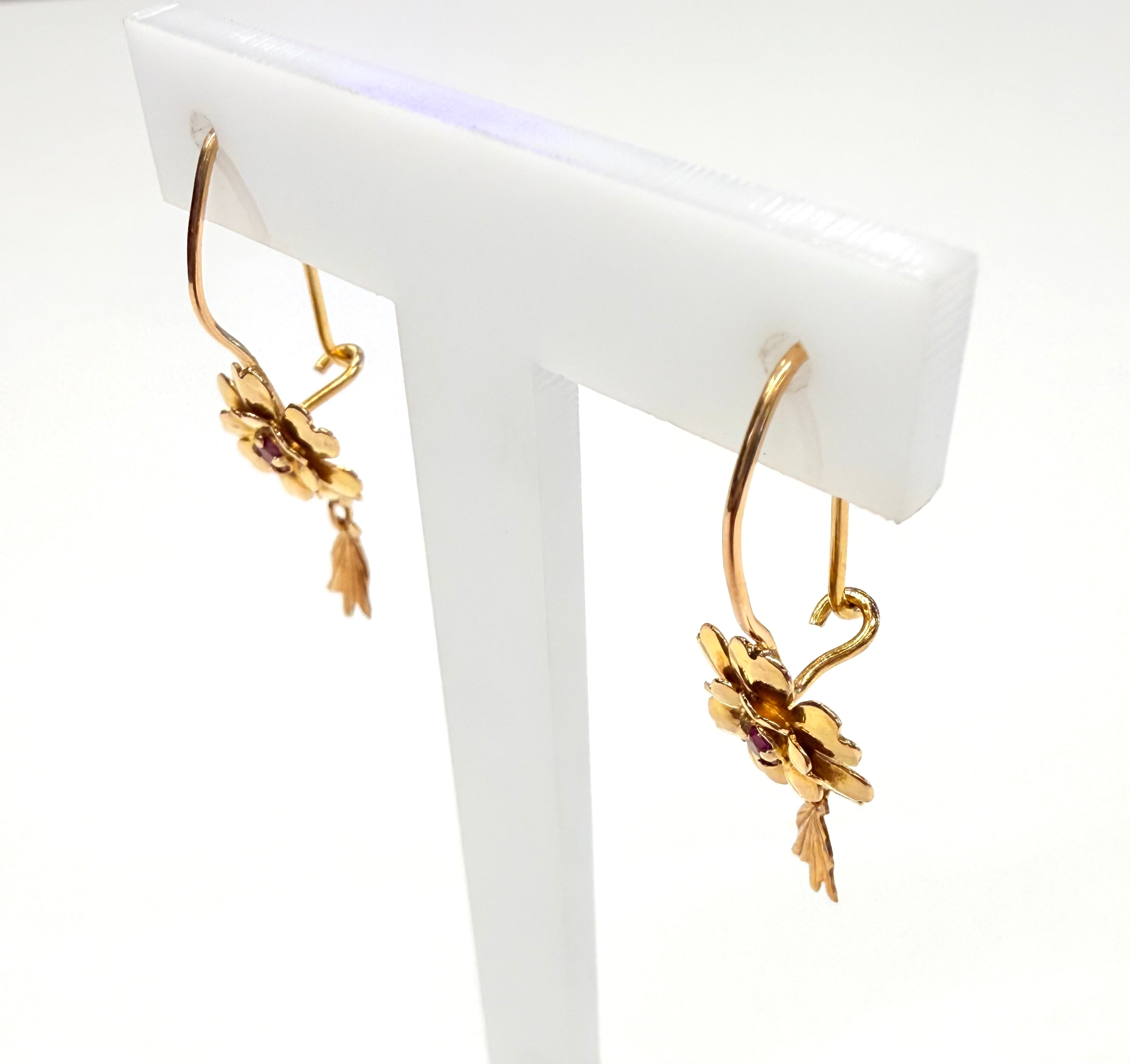 Boucles d’oreilles dormeuses en or jaune 18 carats (750/1000). Fermoir de type dormeuse. Poids : 2,72 g. Hauteur : 3,5 cm – Largeur : 1,1 cm – Épaisseur : 0,1 cm. Serties de deux rubis d’environ 0,2 cm chacun. État : très bon.