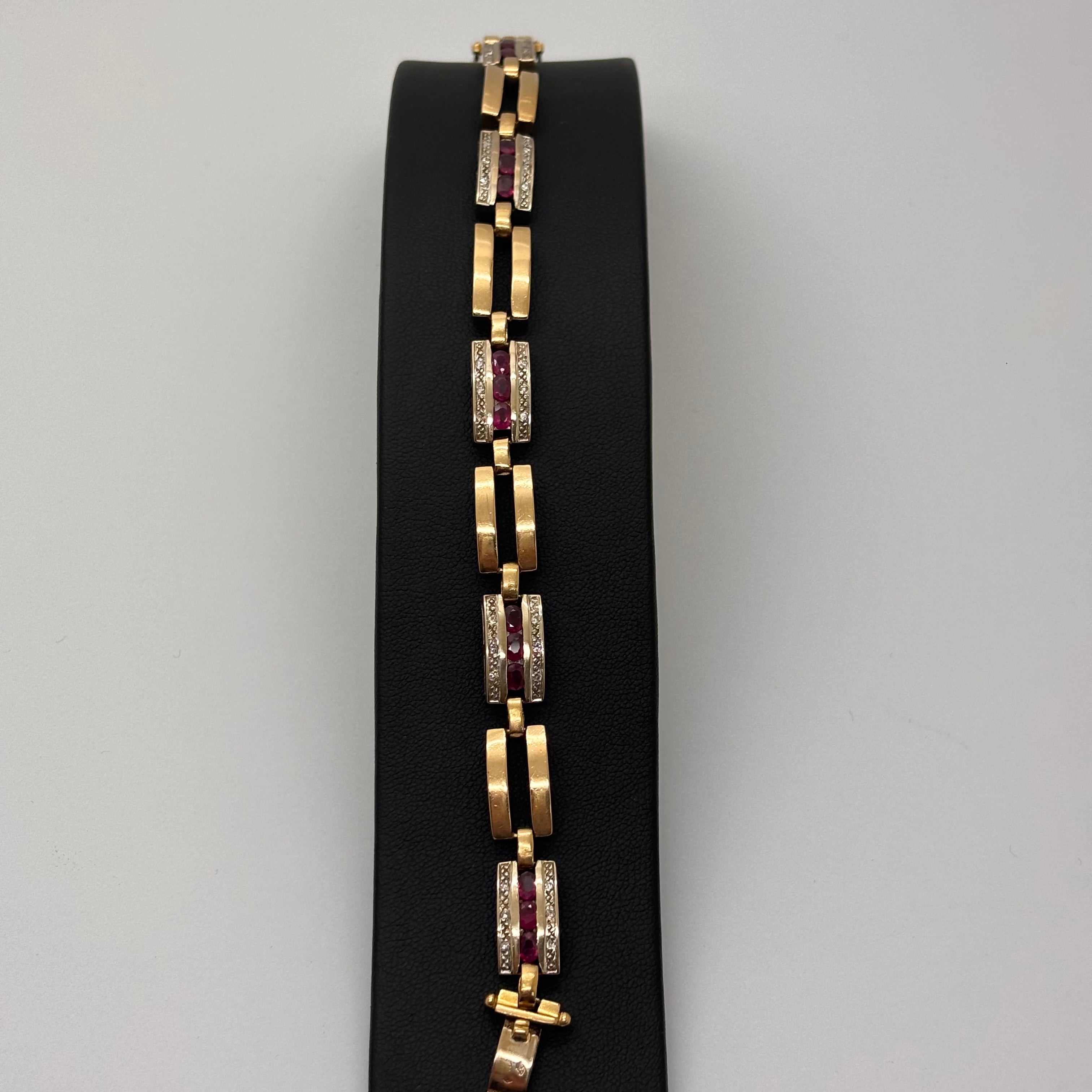 Bracelet gourmette en or jaune 18 carats (750/1000), maille gourmette, poinçon « Tête d’Aigle ». Poids : 26,93 g · Longueur : 19 cm · Largeur : 8 mm · Épaisseur : 3 mm · Fermoir à cliquet. Sertissage : 30 petits diamants + 15 rubis. État : bon état.