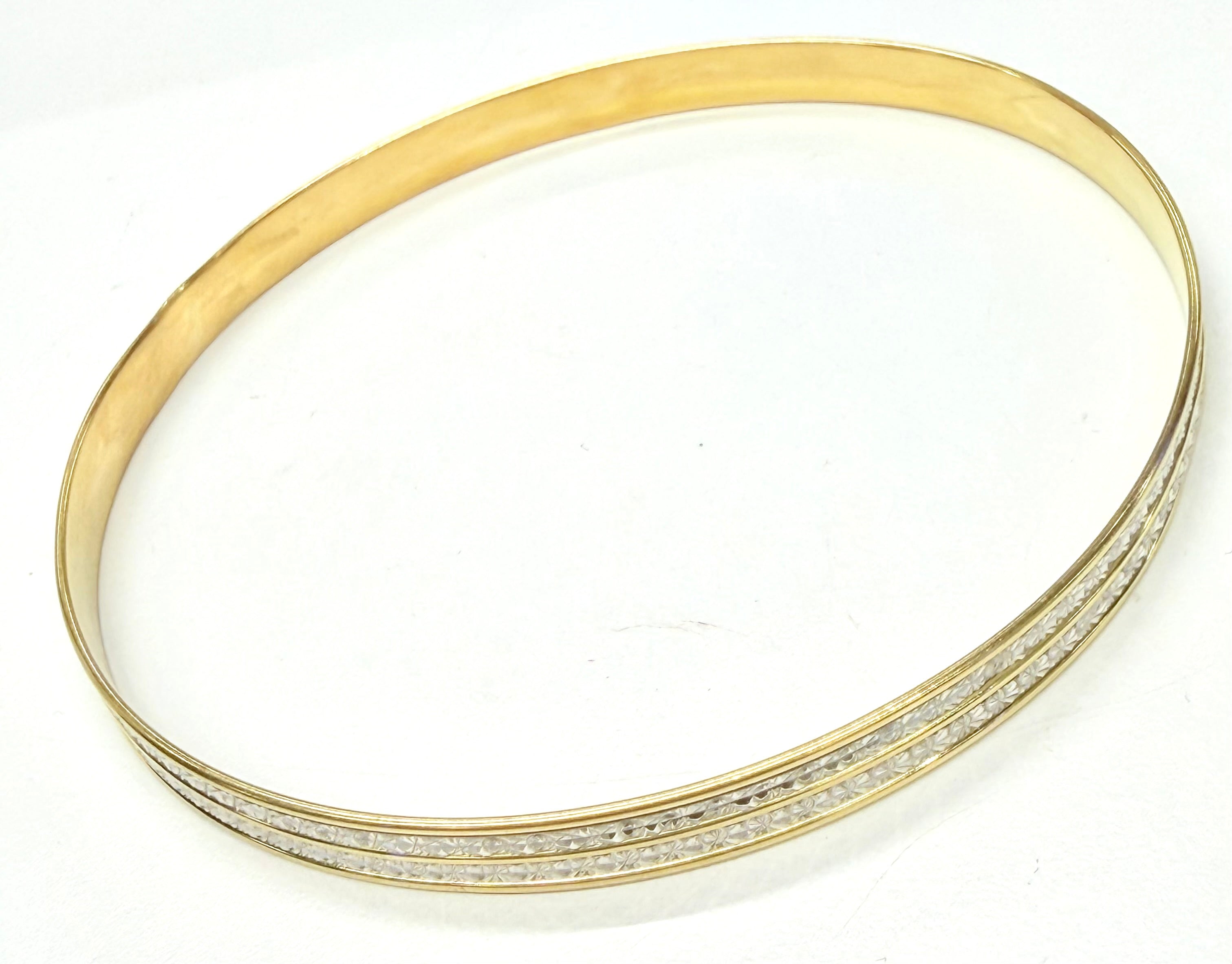 Bracelet jonc en or 18 carats (750/1000) mêlant or jaune et or blanc, réalisé en maille pleine pour une solidité durable. Certifié par le poinçon Tête d’Aigle, il affiche une épaisseur de 5 mm et un poids de 11,27 g, offrant une belle présence au poignet. Sans fermoir, ce jonc en très bon état.