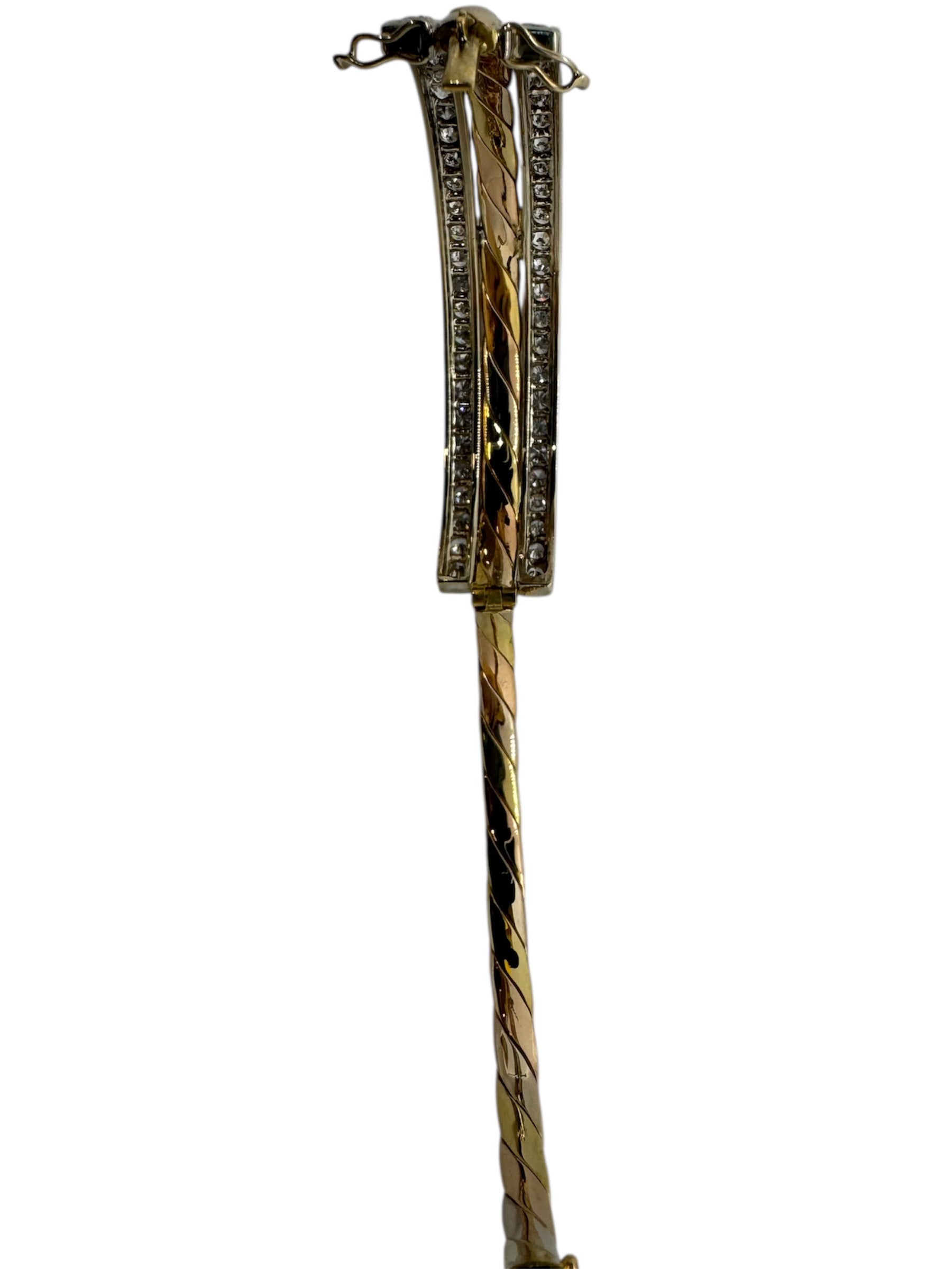 Chef-d’œuvre de joaillerie, ce somptueux bracelet jonc en trois ors révèle toute l’harmonie entre élégance intemporelle et éclat absolu. Sertie de 54 diamants d’une brillance remarquable, totalisant 5,40 carats de gemme, cette création incarne le raffinement. Cette pièce rare, conjugue la noblesse des ors à l’éclat du diamant. Symbole d’excellence et de sophistication absolue, ce jonc saura mettre votre poignet délicat en valeur.