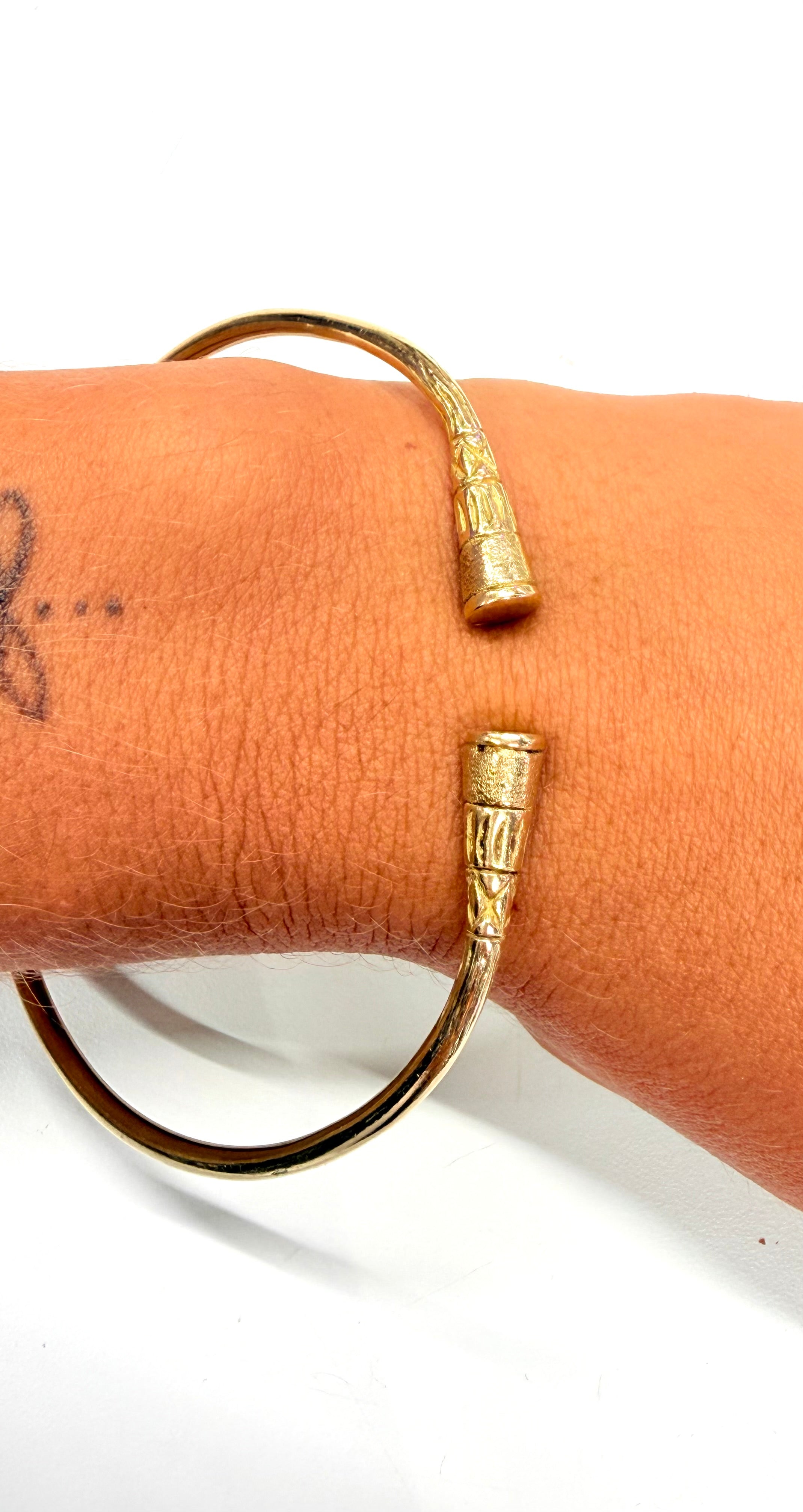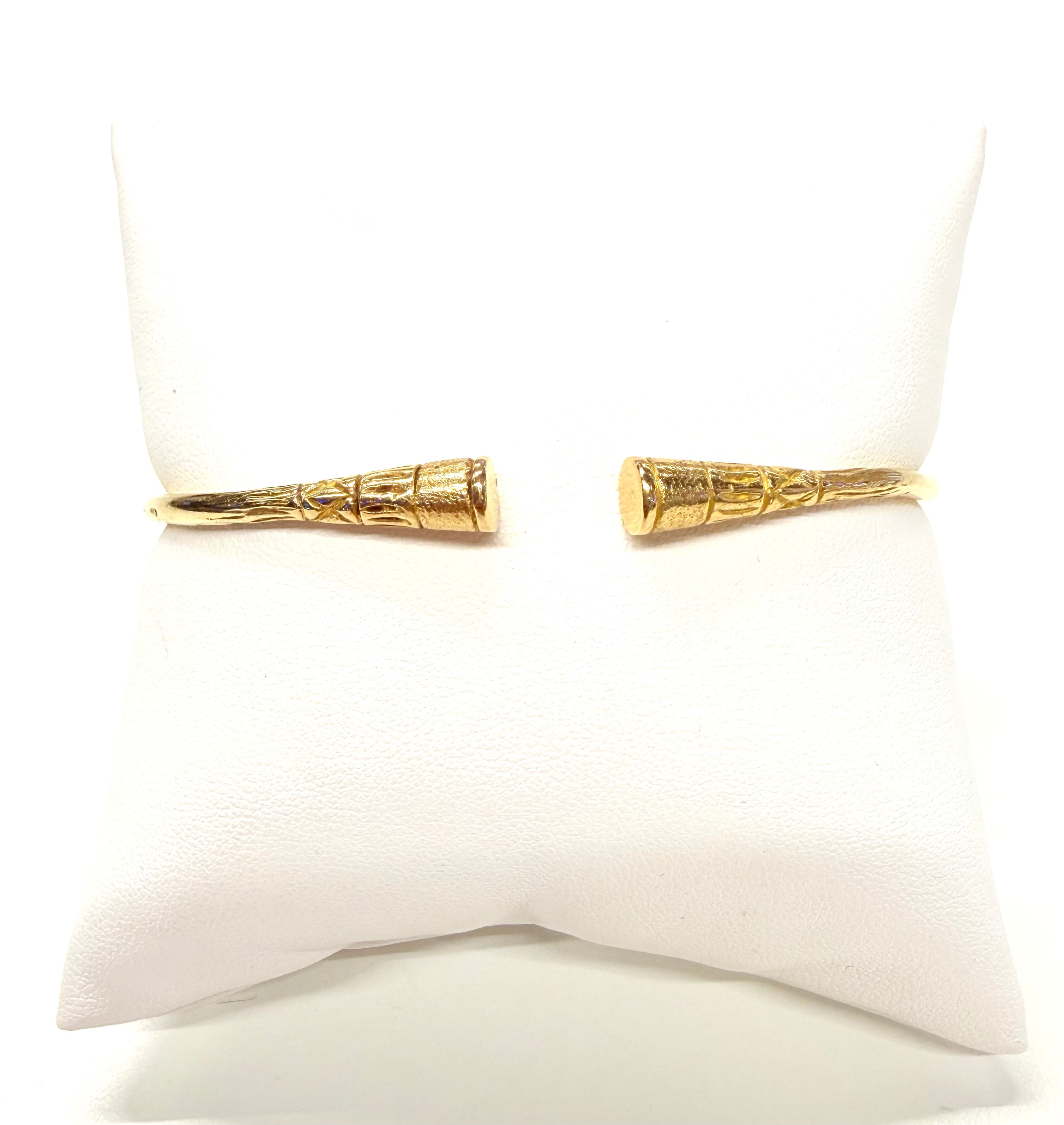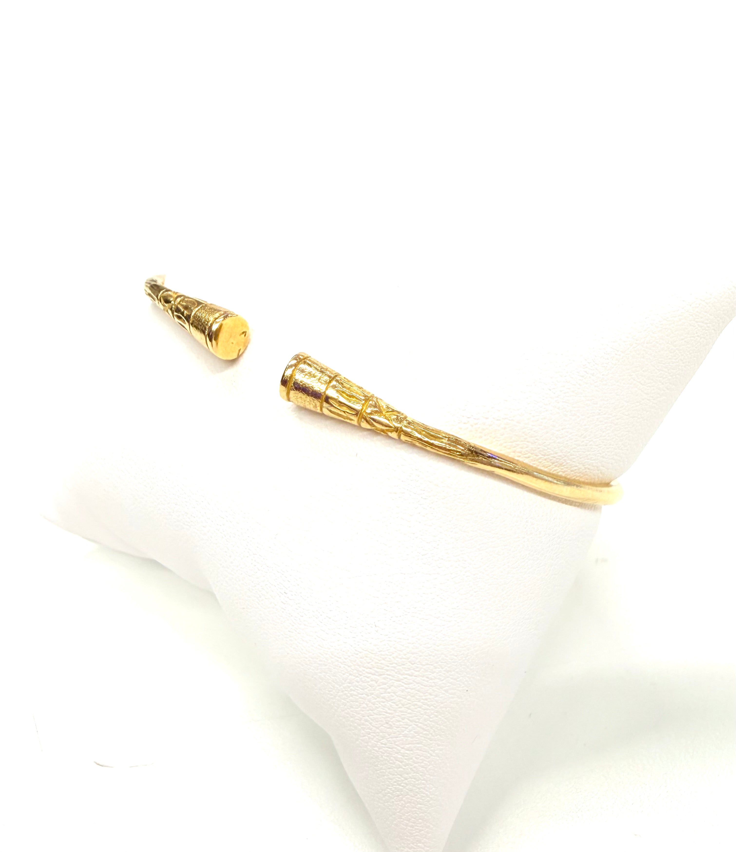Bracelet jonc en or jaune 18 carats (750/1000), poinçonné tête d’aigle. Il s’agit d’un modèle de maille jonc malgache, d’un diamètre de 7 cm, avec une largeur et une épaisseur de 0,3 cm. Son poids est de 21,71 grammes. Le bracelet est ouvert, en très bon état général, avec quelques légères traces d’usure.