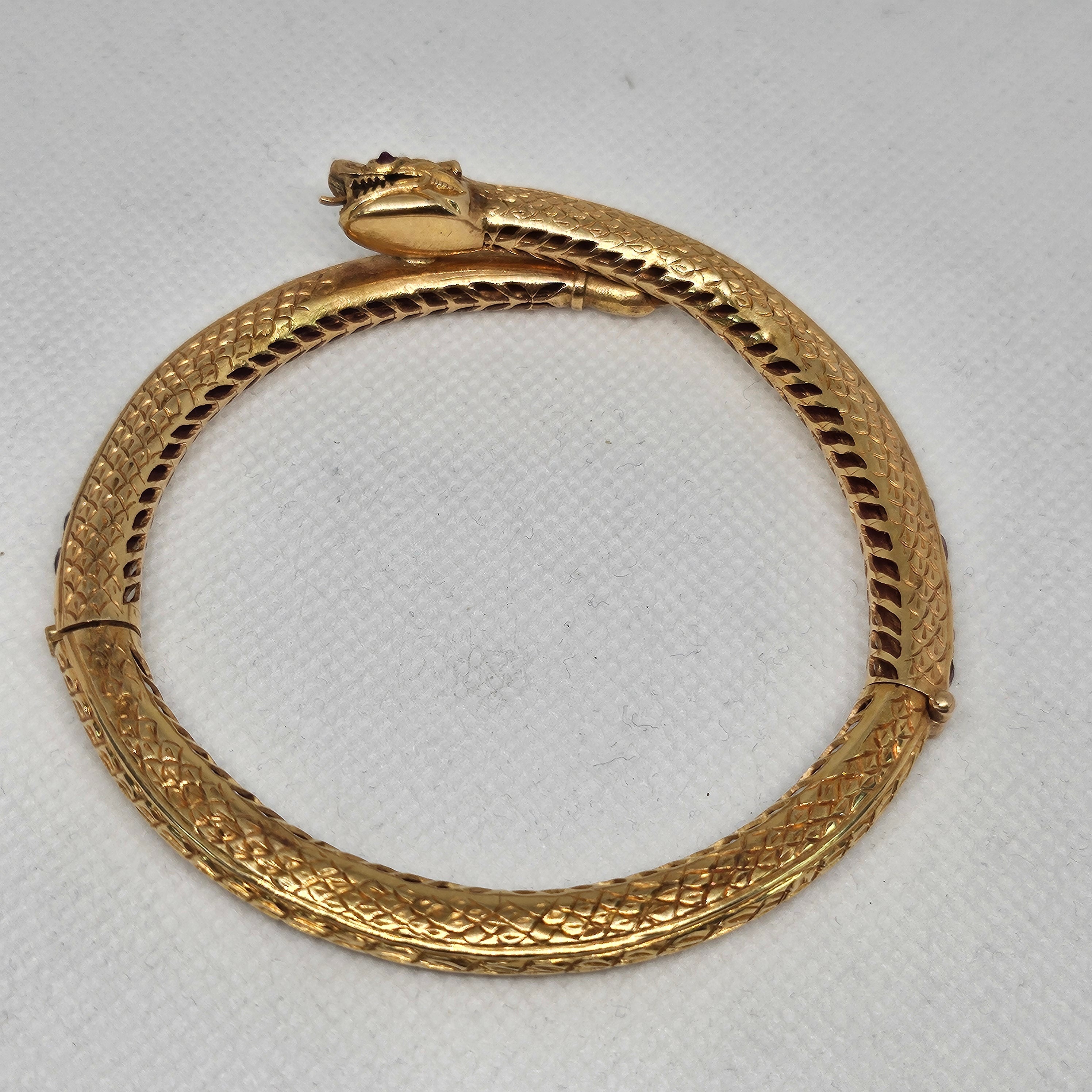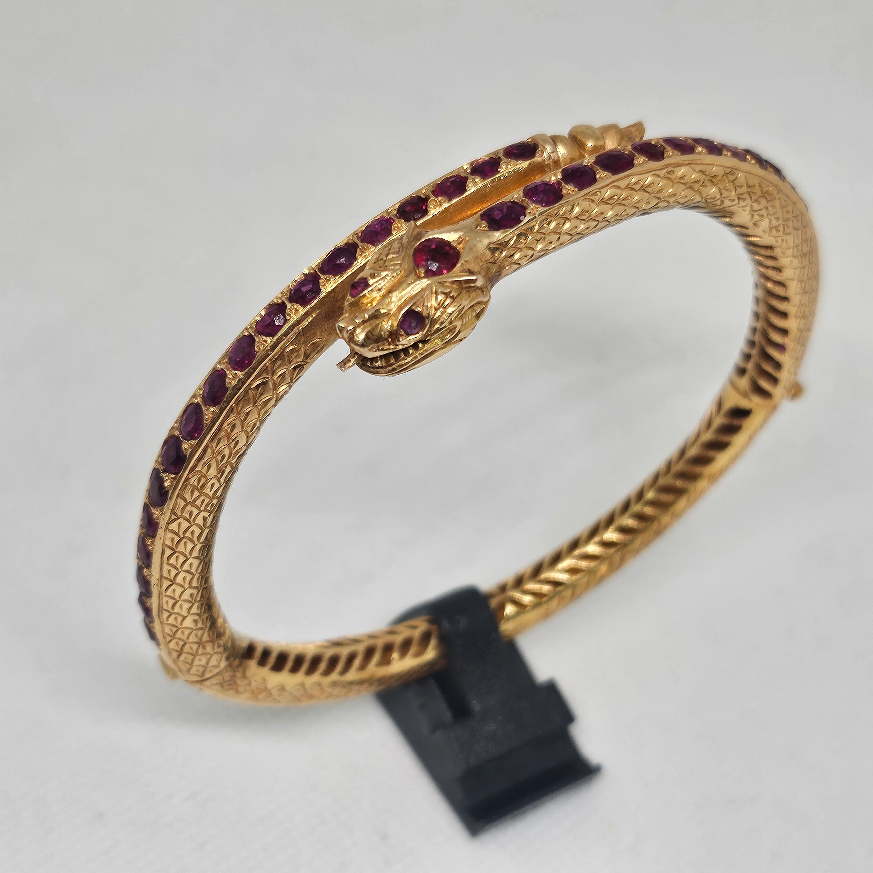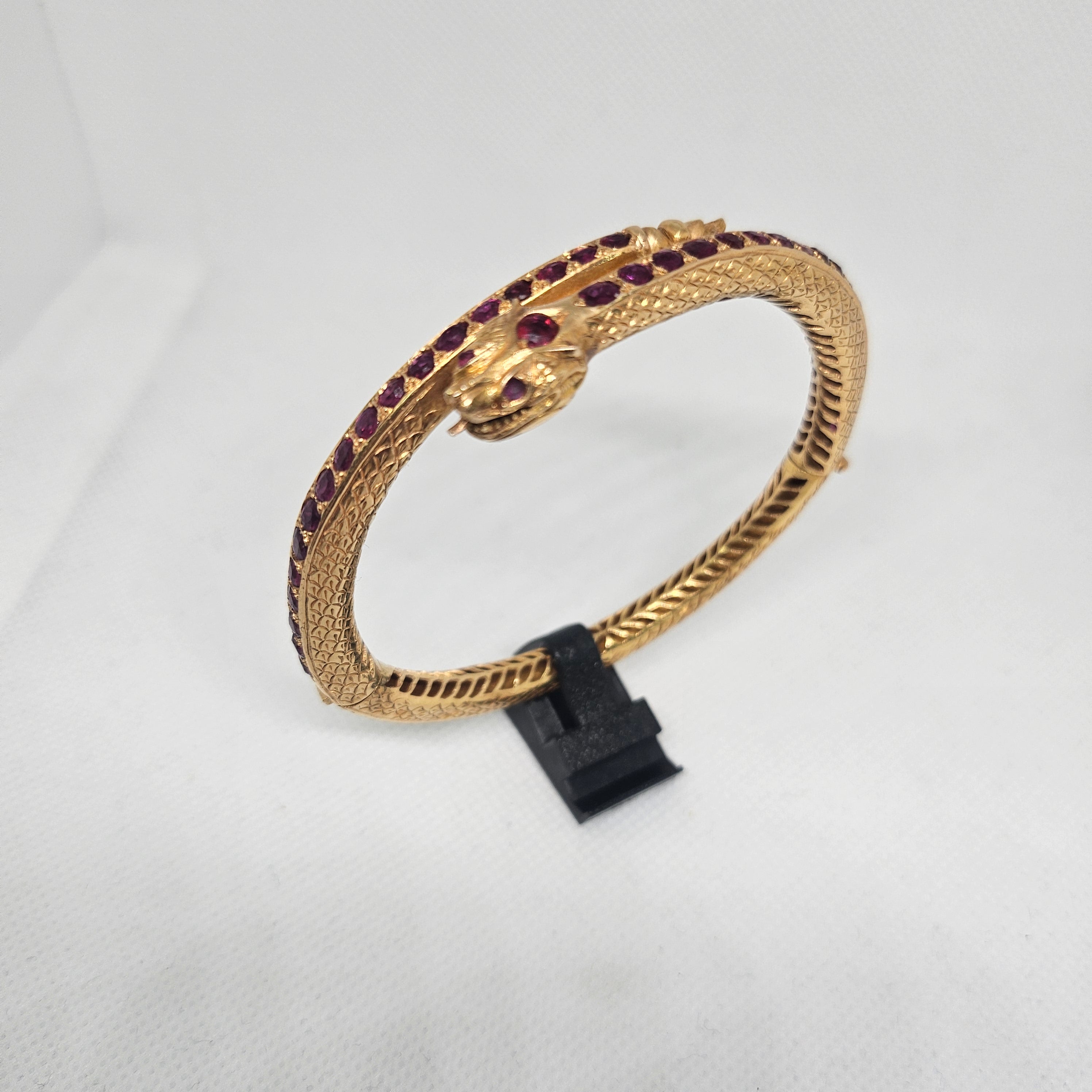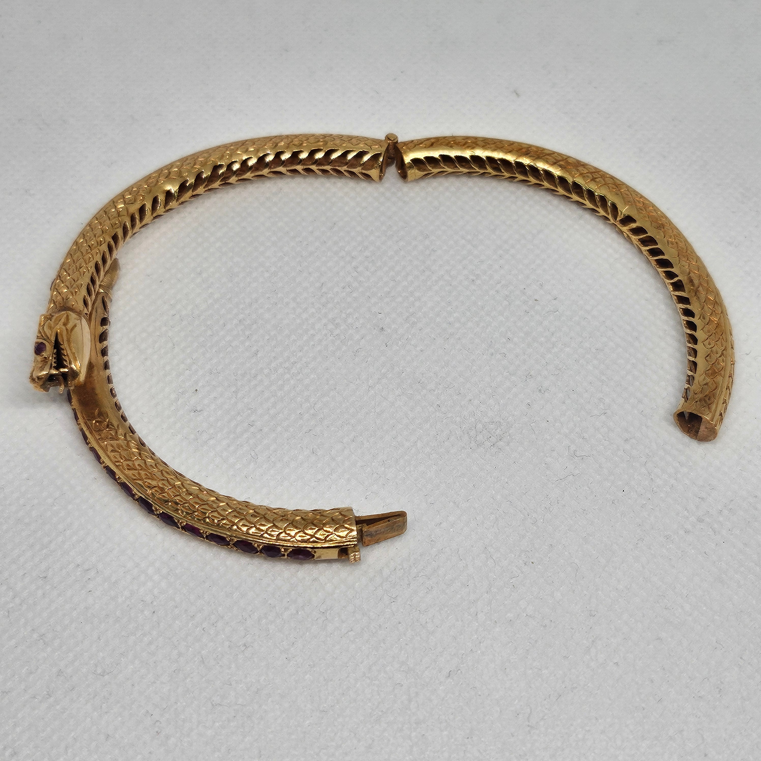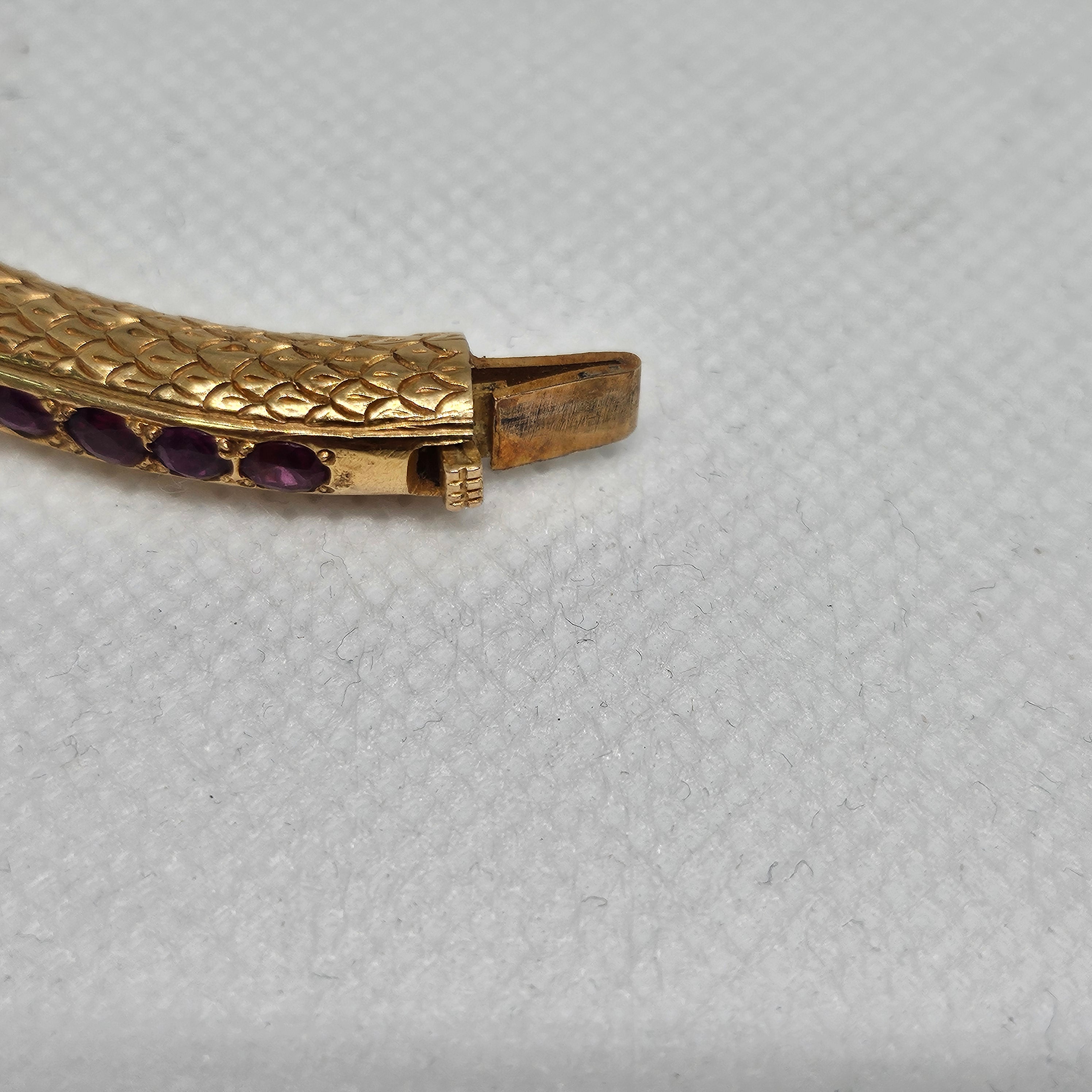 Jonc en or jaune 18 carats (750/1000), poinçonné 750 et tête d’aigle, serti de 39 améthystes. Il pèse 28,53 grammes et mesure 26 cm de long, avec une largeur et une épaisseur de 0,6 cm. Fermoir à cliquet. Présenté en très bon état général.