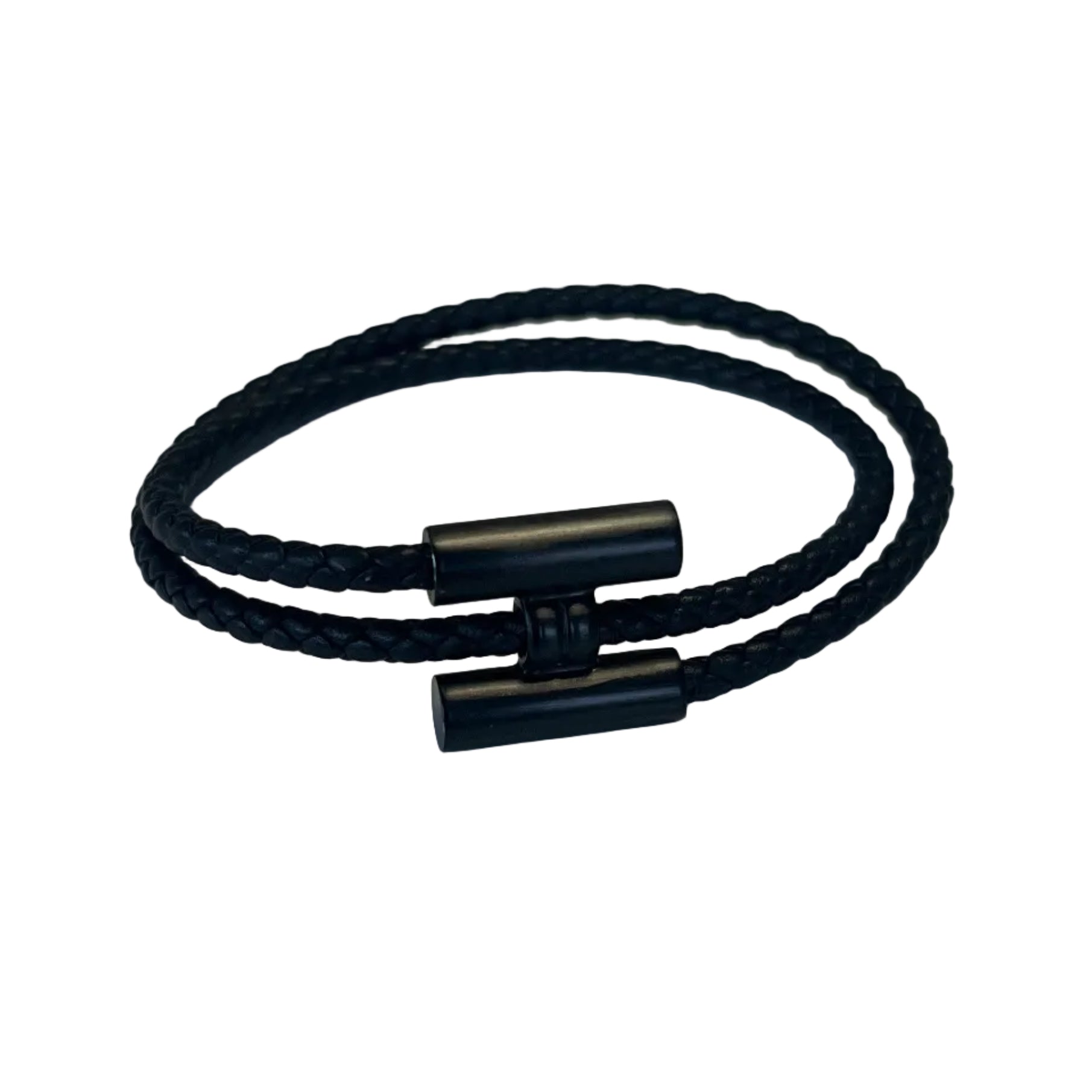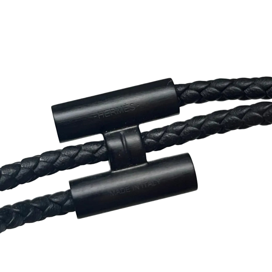 Bracelet tressé en cuir de veau Swift, souple et résistant. Fermoir à cliquet pratique et sécurisé. Longueur 40 cm, largeur 16 cm, épaisseur 0,3 cm. En très bon état, un bracelet au style sobre et élégant, facile à porter au quotidien. Valeur du neuf : 490€.