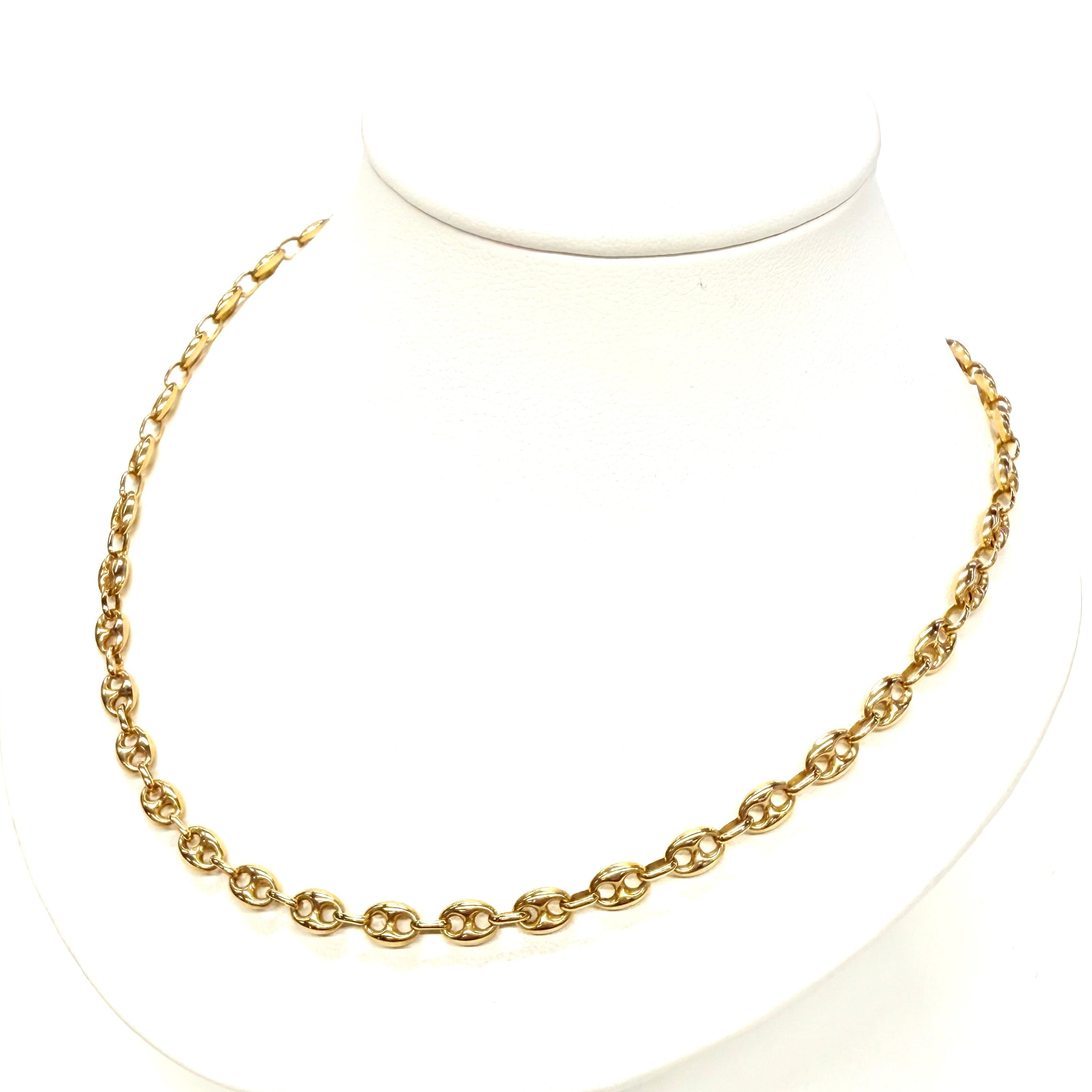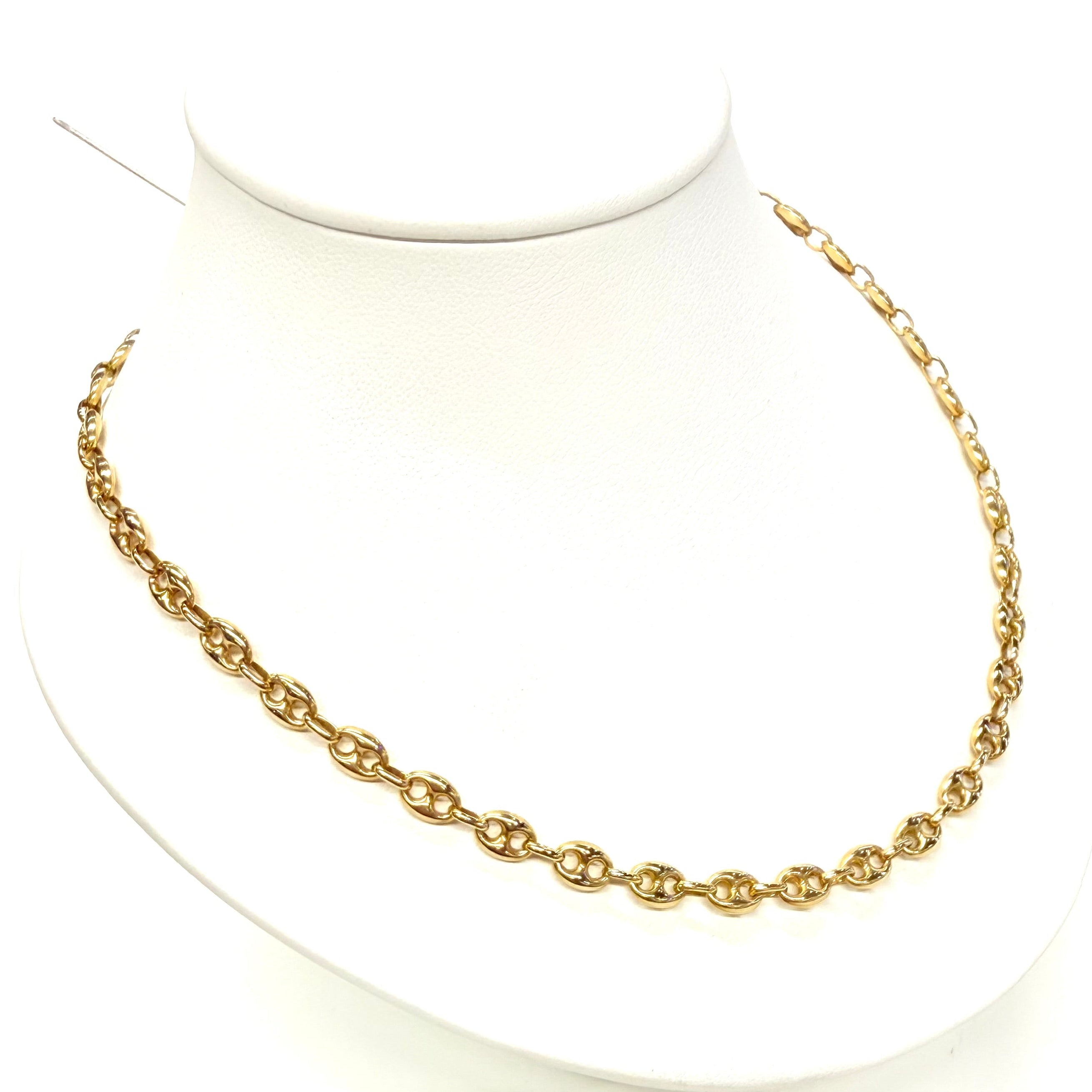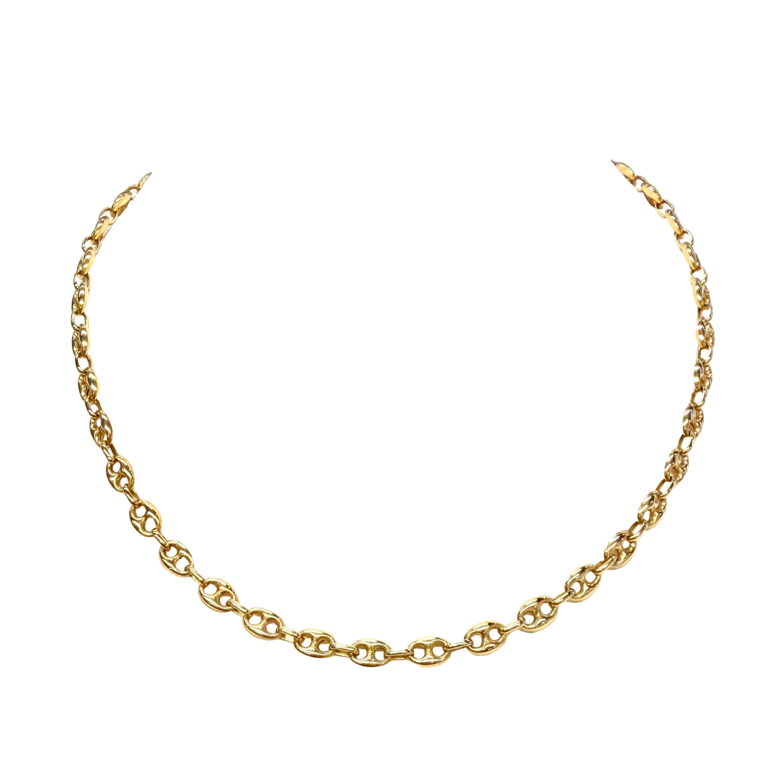 collier grain de café en or jaune 750/1000, 11,76 g, 46 cm. Fermoir mousqueton, poinçon tête d’aigle. Un bijou raffiné en très bon état.