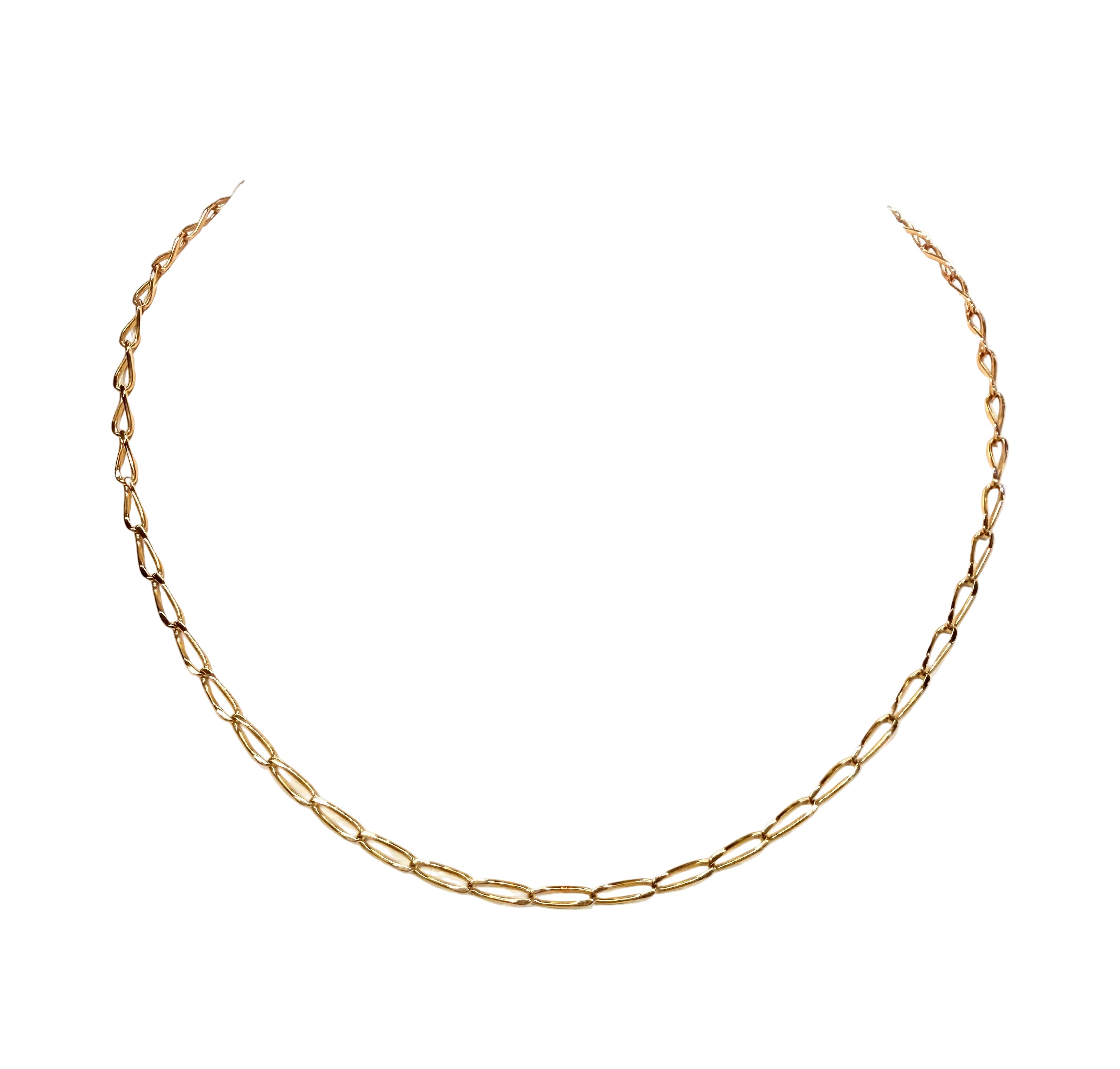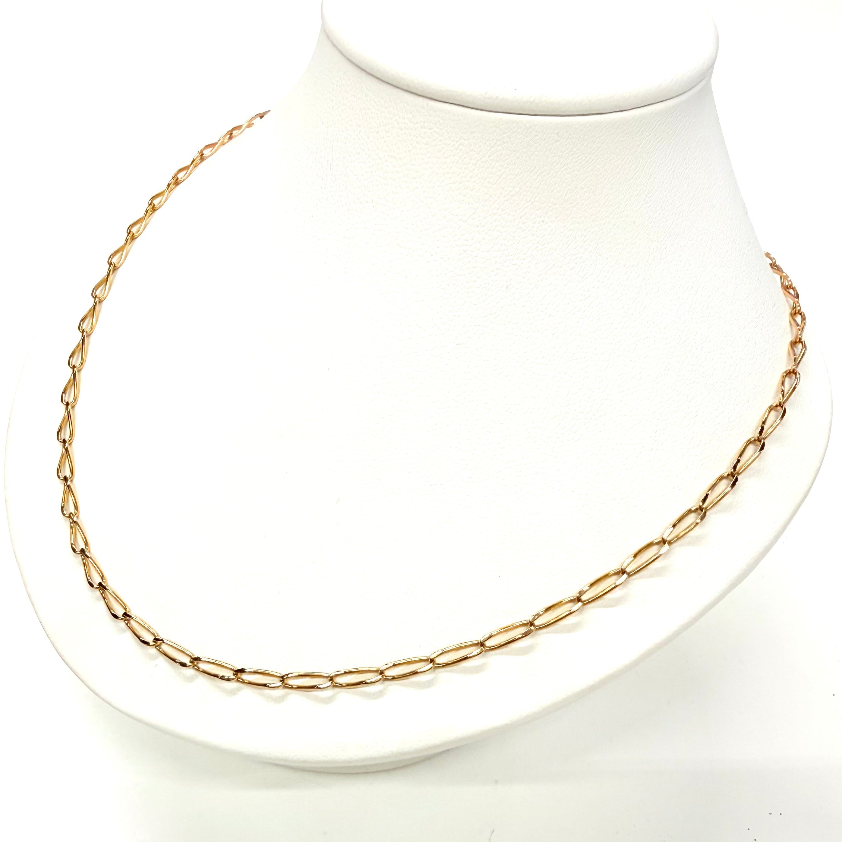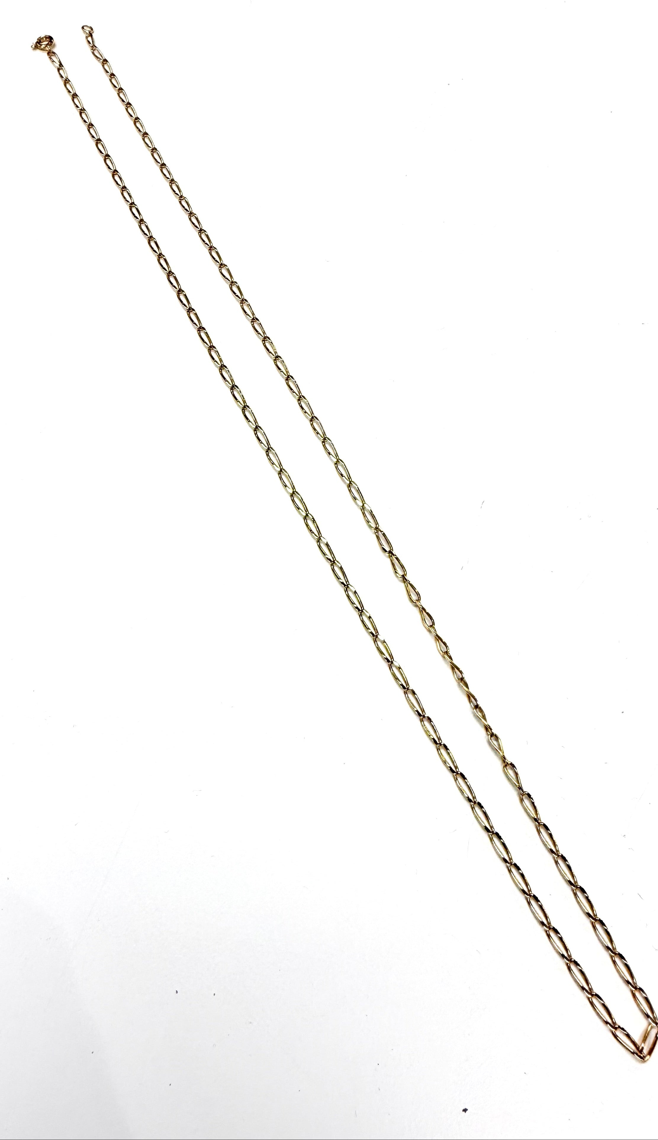 Chaîne longue en or jaune 750/1000, poids 10,31 g, 65 cm. Maille cheval fine, fermoir anneau ressort, poinçon 750. en très bon état.