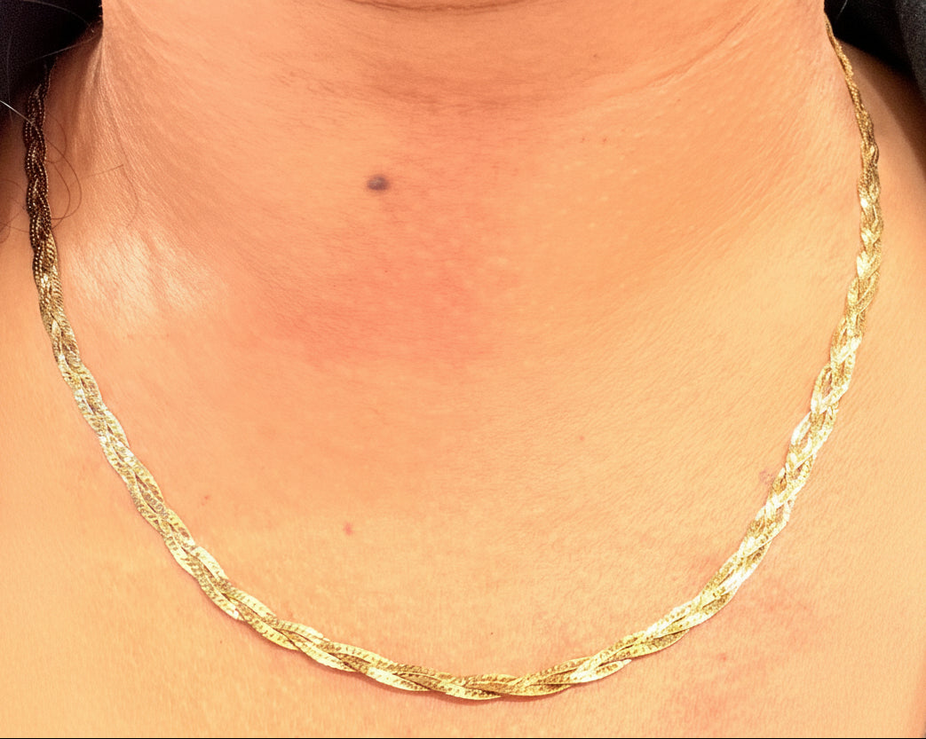 Collier princesse tressé en or jaune 18 carats (750/1000) avec fermoir anneau ressort. Poids 8,96 g, longueur 50 cm, largeur 4 mm, épaisseur 1 mm. En bon état, élégant et raffiné pour un porté quotidien ou en occasion.