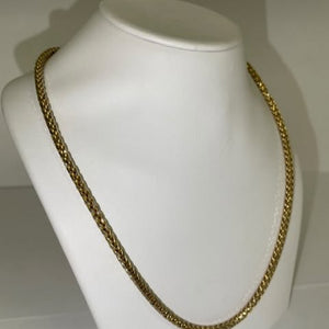 Collier ras du cou en or jaune 18 carats (750/1000), maille tressée, doté d’un fermoir mousqueton sécurisé. Il pèse 12,12 grammes et mesure 45 cm de long, avec une largeur de 0,5 cm. Sans pierres, il présente un poinçon 750 et se trouve en bon état général.