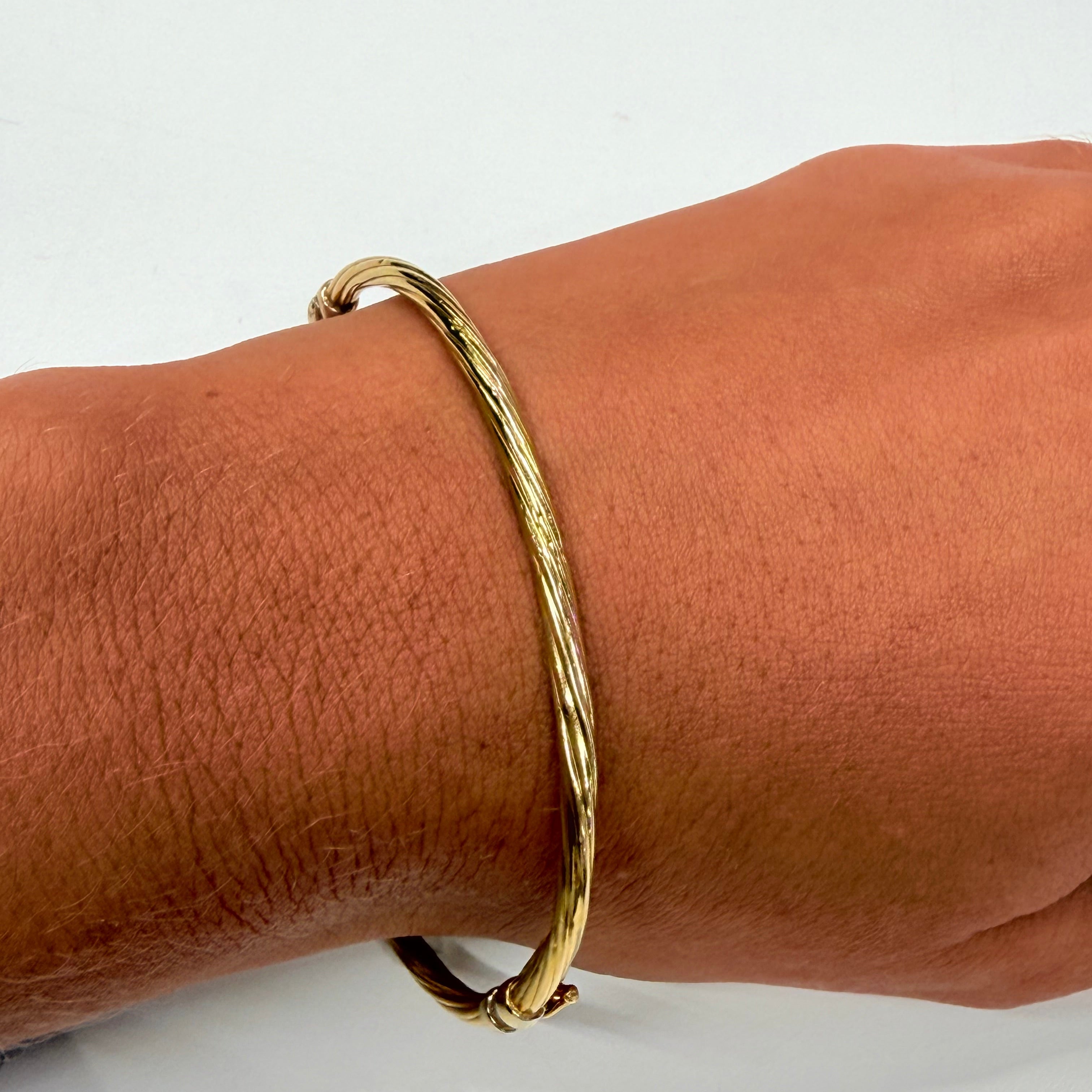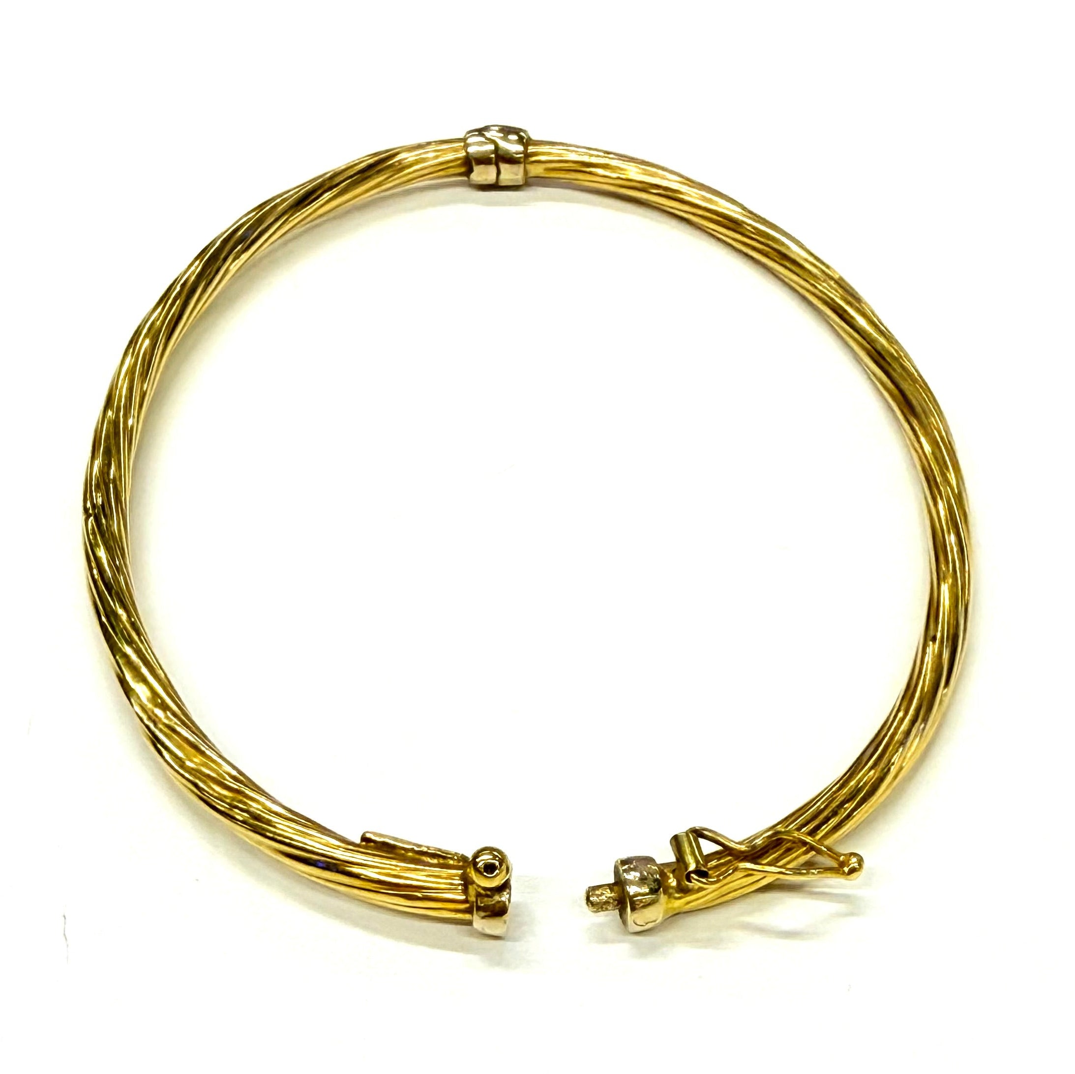 Bracelet jonc en or jaune 750/1000 (18 carats), au design torsadé classique. Ce modèle rigide se porte facilement au poignet grâce à son fermoir à cliquet sécurisé. Conception élégante sans pierres, mettant en valeur la pureté de l’or.